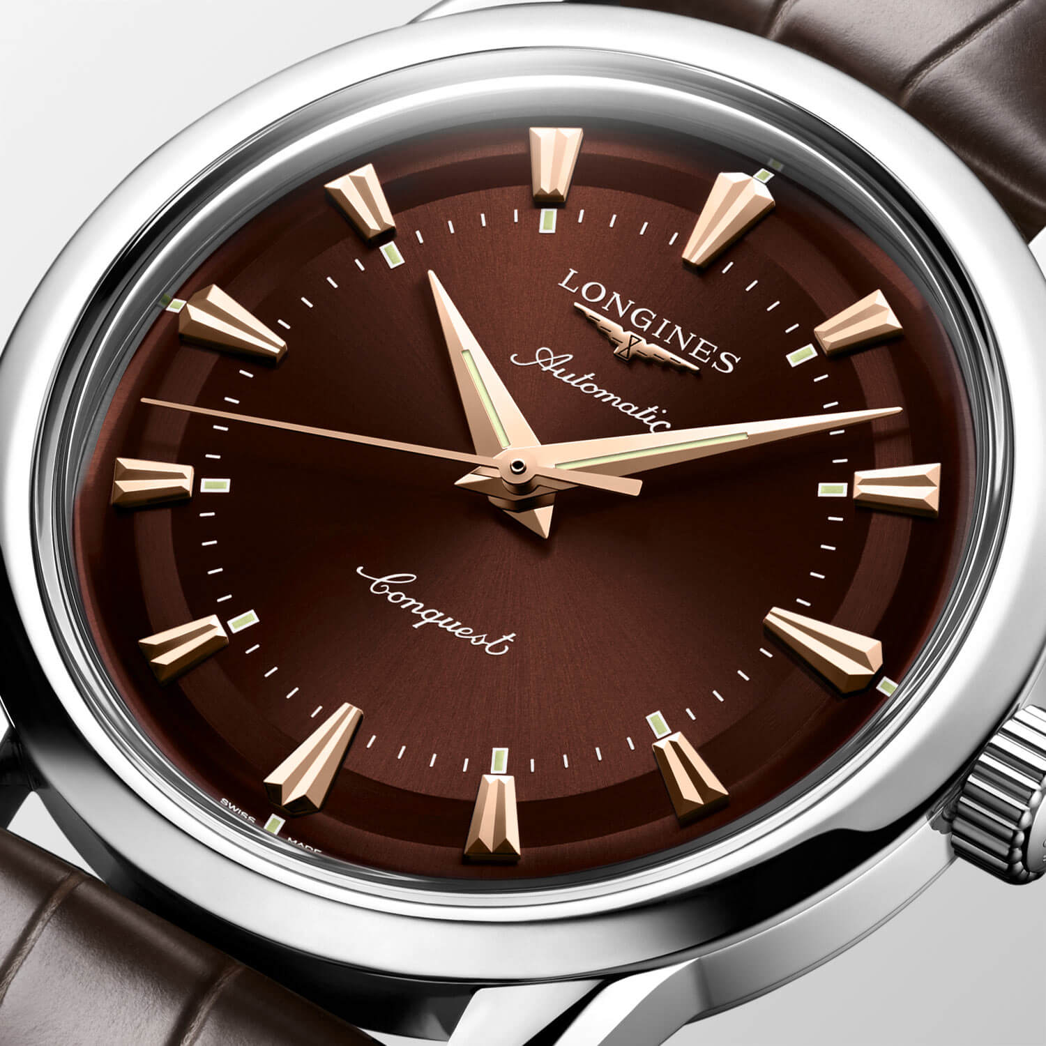 Tarcza w odcieniu brązu z efektem sunburst emanuje spokojem i dystynkcją. Złocone wskazówki typu dauphine oraz nakładane indeksy w formie stożków zostały pokryte różowozłotą powłoką, tworząc szlachetne kontrasty na tle tarczy. Charakterystyczne logo uskrzydlonej klepsydry i subtelny układ elementów są wiernym nawiązaniem do archiwalnych projektów marki. Pod powierzchnią tarczy pracuje mechanizm Longines L888 – szwajcarski kaliber automatyczny z 72-godzinną rezerwą chodu i antymagnetyczną sprężyną włosową, zapewniającą stabilność pracy w codziennych warunkach. Longines Automatic L1.649.4.62.2 na skórzanym pasku to więcej niż zegarek – to spójna opowieść o tradycji, stylu i niezawodnej precyzji.