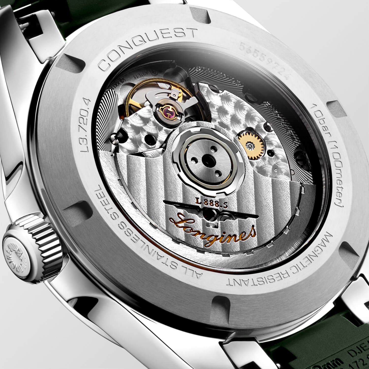 Wewnątrz obudowy pracuje szwajcarski mechanizm automatyczny kaliber L888, znany z doskonałej precyzji, niezawodności oraz swoich właściwościach antymagnetycznych, dzięki specjalnej sprężynie krzemowej. To zaawansowane technologicznie rozwiązanie zapewnia długotrwałe i dokładne działanie zegarka, czyniąc go idealnym wyborem zarówno dla miłośników sportowej elegancji, jak i osób poszukujących precyzyjnego czasomierza na co dzień. Longines dba o to, aby każdy element zegarka spełniał najwyższe standardy jakości, co stanowi jeden z filarów renomy tej marki. Zastosowanie kalibru L888 gwarantuje również komfort użytkowania dzięki płynnemu i precyzyjnemu wskazywaniu czasu.