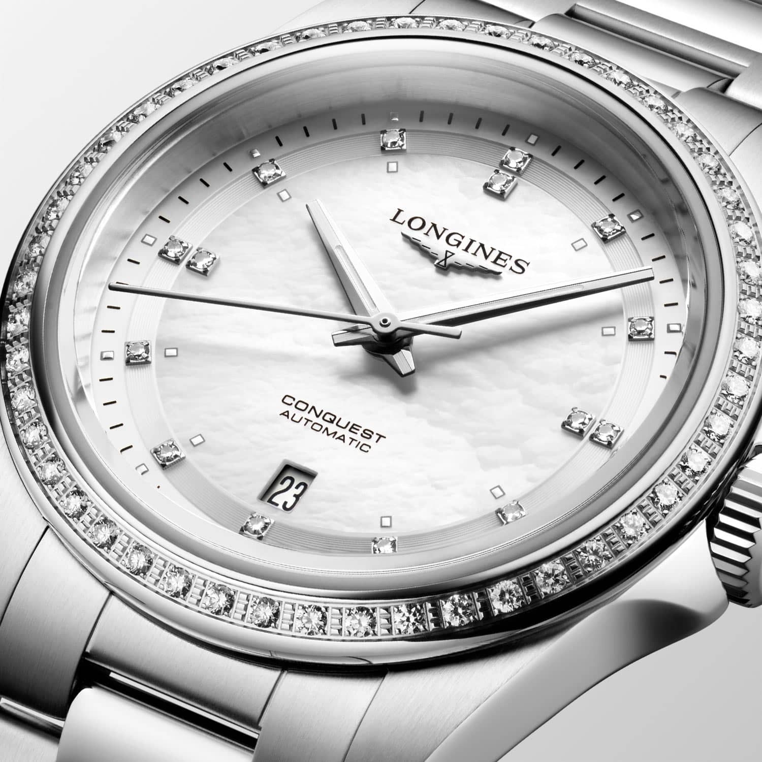 Z okazji jubileuszu 70-lecia premiery linii Conquest została ona wzbogacona o nowe wersje, które łączą sportowy szyk, ponadczasowe wzornictwo i zaawansowane rozwiązania, idealne do codziennego użytku. Jednym z nich jest damski zegarek Longines Conquest L3.320.0.87.6, wyróżniający się olśniewającymi diamentami. Zegarek ten posiada 15 prawdziwych diamentów Top Wesselton VS-SI na unikatowej wzornictwem perłowej tarczy oraz 48 diamentów Top Wesselton IF-VVS na pierścieniu koperty. Delikatne znaczniki towarzyszące diamentom na tarczy oraz rodowane i polerowane wskazówki godzinowa i minutowa pokrywa powłoka Super-LumiNova®, zapewniając optymalną czytelność o każdej porze dnia. Nieskazitelny odczyt wspiera odporne na zarysowania szkło szafirowe z wielowarstwową powłoką antyrefleksyjną po obu stronach.