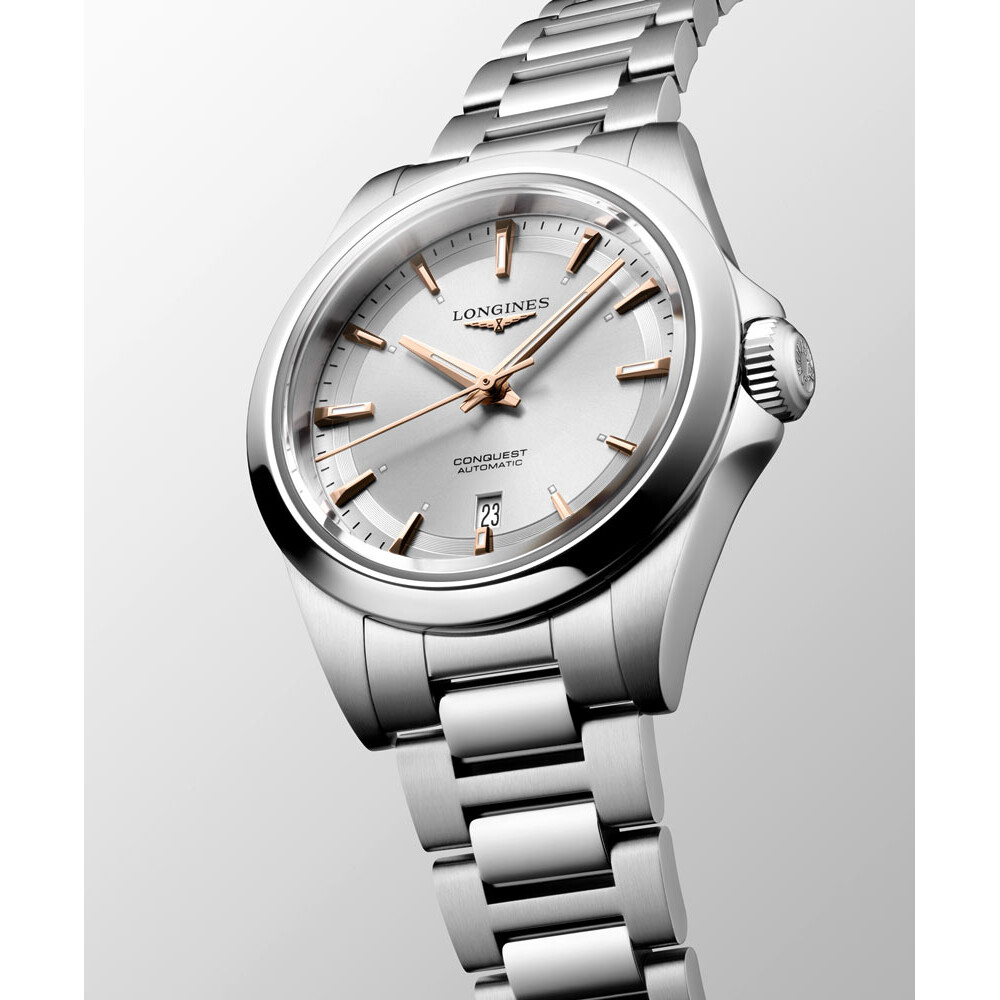 Z okazji jubileuszu 70-lecia premiery linii Conquest została ona wzbogacona o nowe wersje, które łączą sportowy szyk, ponadczasowe wzornictwo i zaawansowane rozwiązania, idealne do codziennego użytku. Jednym z nich jest damski zegarek Longines Conquest L3.320.4.72.6. Czasomierz ten posiada błyszczącą blaskiem słonecznym tarczę w kolorze srebrnym. Indeksy na tarczy oraz rodowane i polerowane wskazówki godzinowa i minutowa pokrywa powłoka Super-LumiNova®, zapewniając optymalną czytelność o każdej porze dnia. Nieskazitelny odczyt wspiera odporne na zarysowania szkło szafirowe z wielowarstwową powłoką antyrefleksyjną po obu stronach.