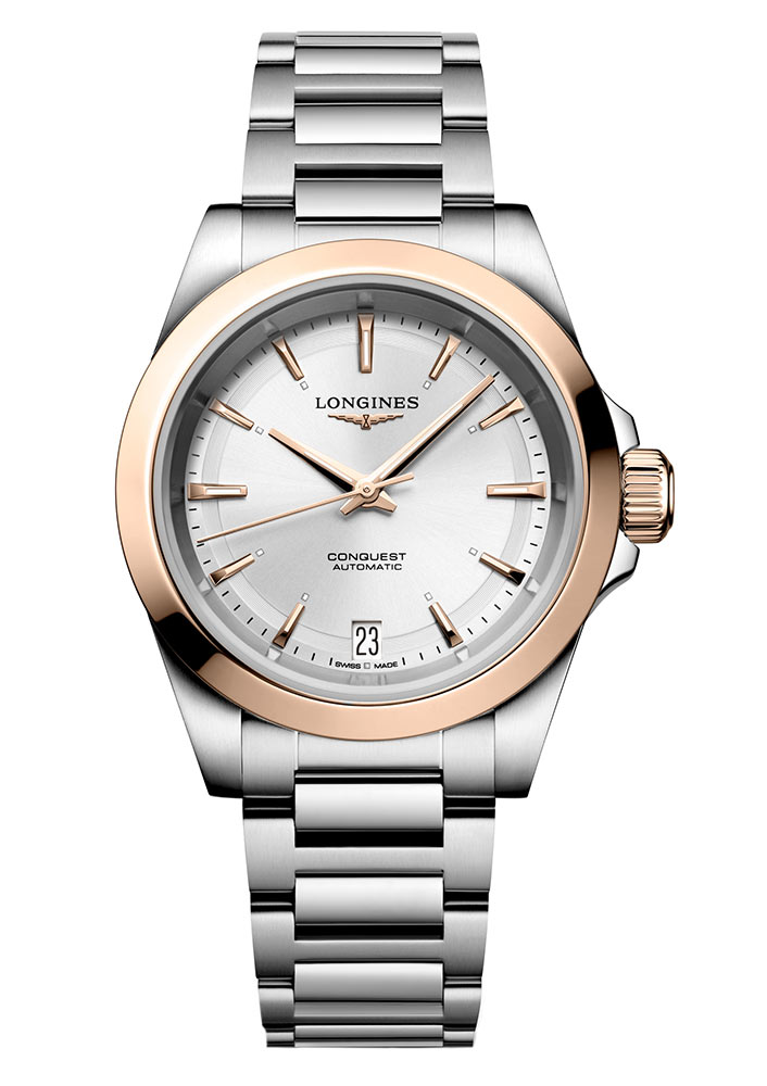 Z okazji jubileuszu 70-lecia premiery linii Conquest została ona wzbogacona o nowe wersje, które łączą sportowy szyk, ponadczasowe wzornictwo i zaawansowane rozwiązania, idealne do codziennego użytku. Jednym z nich jest damski zegarek Longines Conquest L3.430.5.72.6, wyróżniający się elegancką srebrną tarczą ze ślimakowym szlifem. Zegarek ten posiada jedenaście nakładanych, złotych indeksów godzin oraz okienko datownika na godzinie 6. Oznaczenia godzin oraz złote, polerowane wskazówki godzinową i minutową pokrywa powłoka Super-LumiNova®, zapewniając optymalną czytelność o każdej porze dnia. Nieskazitelny odczyt wspiera odporne na zarysowania szkło szafirowe z wielowarstwową powłoką antyrefleksyjną po obu stronach.