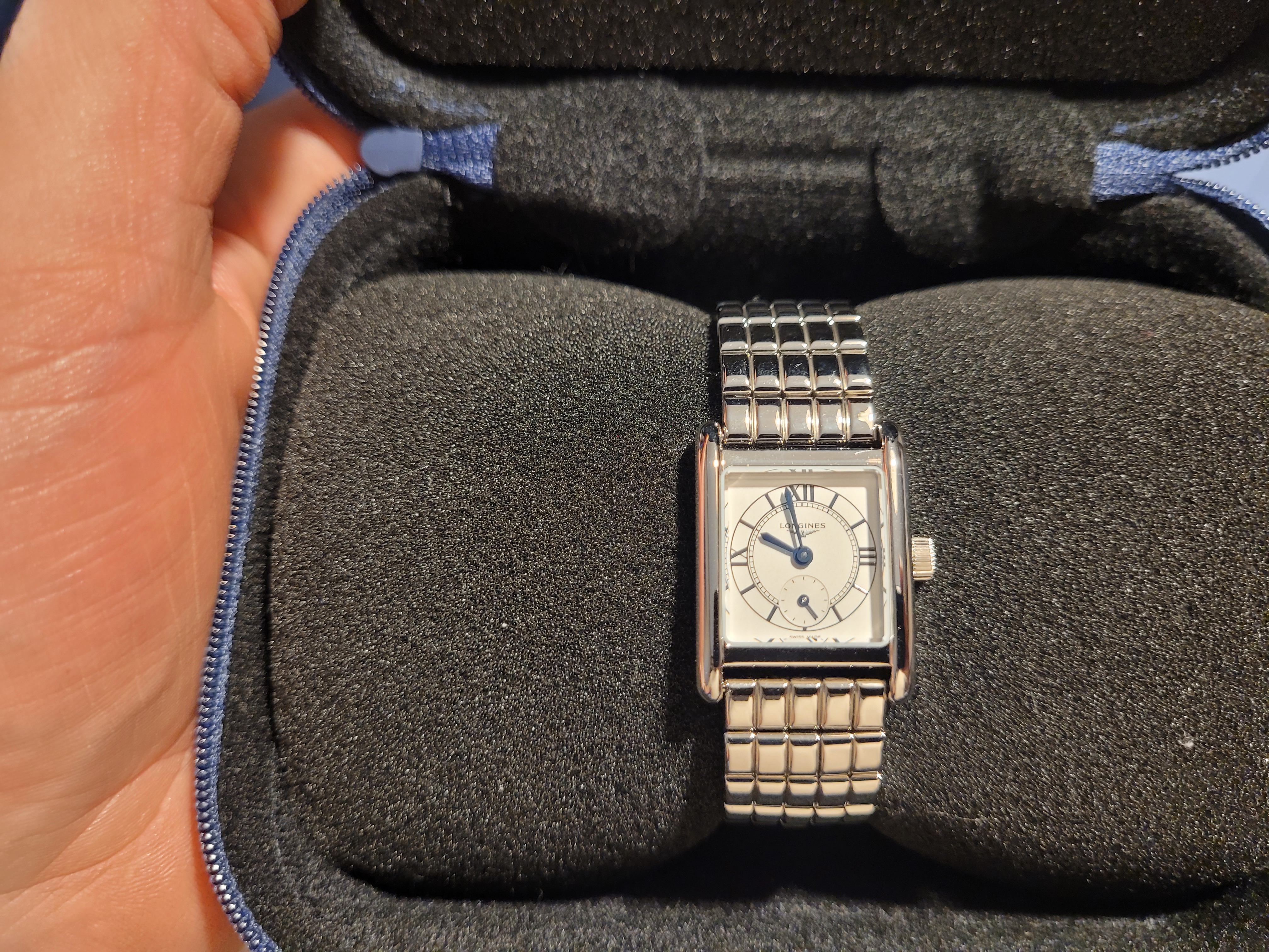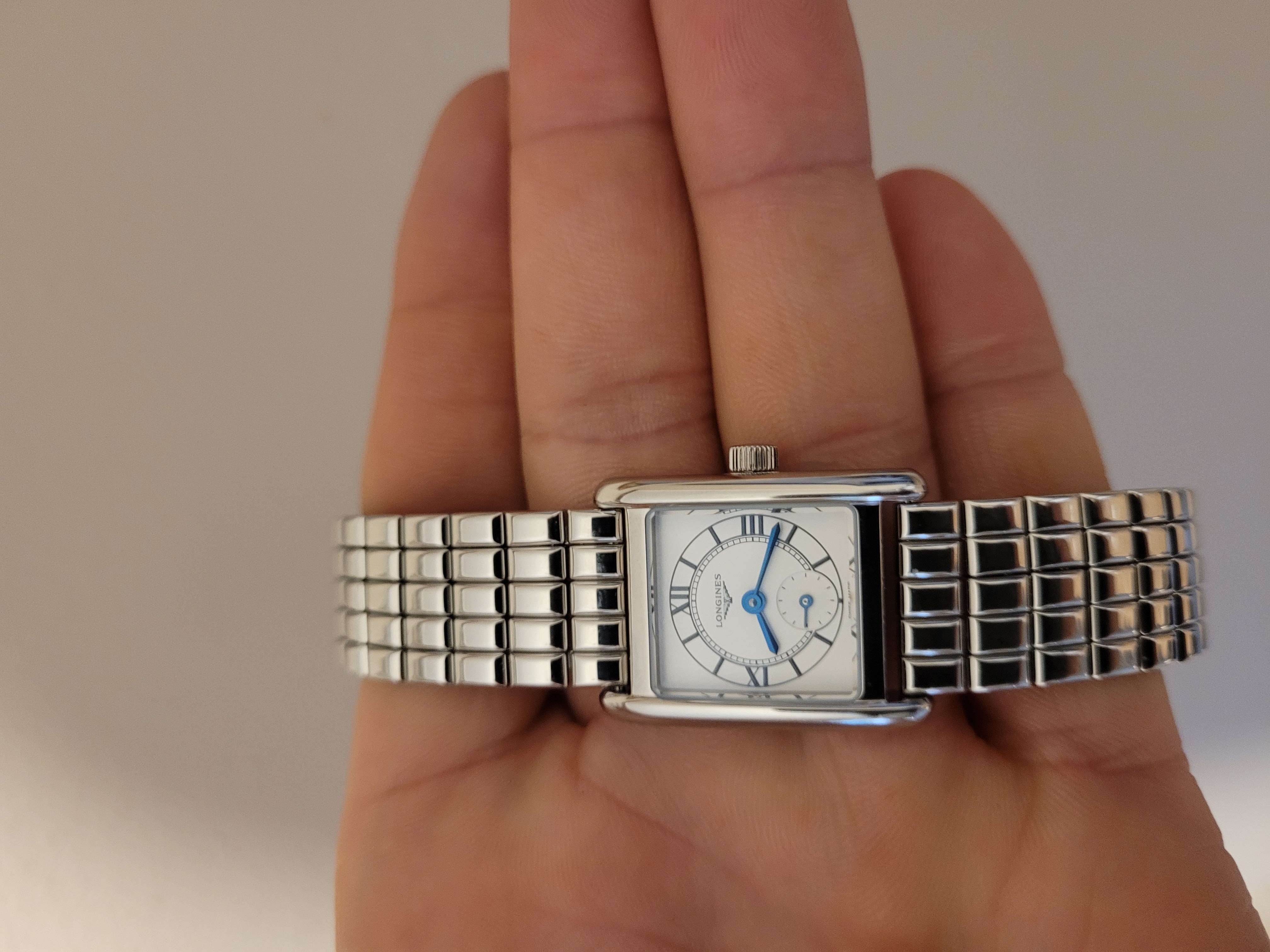 Powyższy drobny zegarek damski na rękę Longines DolceVita Mini wyróżnia nowy rodzaj tarczy Cosmo z piaskowanym wykończeniem i okrągłym motywem zamkniętym w prostokątnym kształcie. Tarcza Cosmo stanowi nienachalną rozgrywkę kontrastów pomiędzy srebrzystym tłem ze słonecznym szlifem, białym, matowym torem godzinowym, srebrzystym wewnętrznym kręgiem ze słonecznym szlifem i białą, matową, okrągłą subtarczą. Malowane cyfry rzymskie i niebieskie wskazówki ze stali oksydowanej zapewniają znakomitą czytelność na tle łagodniejszej tonacji tarczy. Wszystko to pod praktycznie całkowicie odpornym na zarysowania i idealnie przejrzystym szkłem szafirowym.