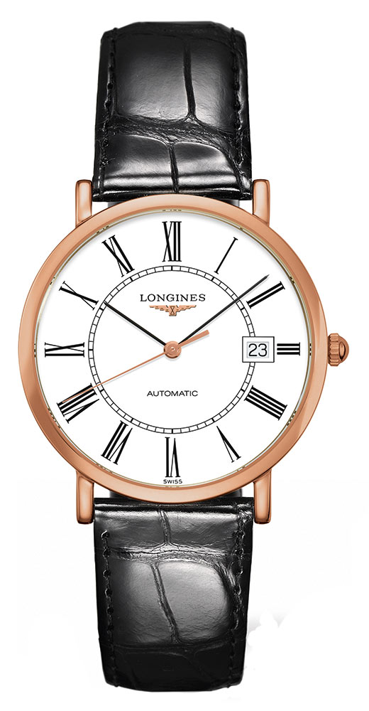 Koperta zegarka wykonana jest z różowego złota 18k o średnicy 37 mm i uszczelniona została do 30 metrów. Na białej matowej tarczy znajdują się cyfry rzymskie, a także datownik z aktualnym dniem miesiąca na pozycji trzeciej. Całość chroniona jest przez szkło szafirowe wysoce odporne na zarysowania i uszkodzenia. Wewnątrz koperty znajduje się mechanizm automatyczny kaliber L888, który gwarantuje precyzyjny pomiar czasu oraz rezerwę chodu do 72 godzin. Na odwrocie obudowy znajduje się przeszklony dekiel chroniony szkłem szafirowym, dzięki któremu podziwiać można pracę mechanizmu. Czasomierz Longines Elegant Automatic zestawiony został z paskiem egzotycznym w kolorze czarnym. Wygodę i bezpieczeństwo zapewni zapięcie motylkowe.
