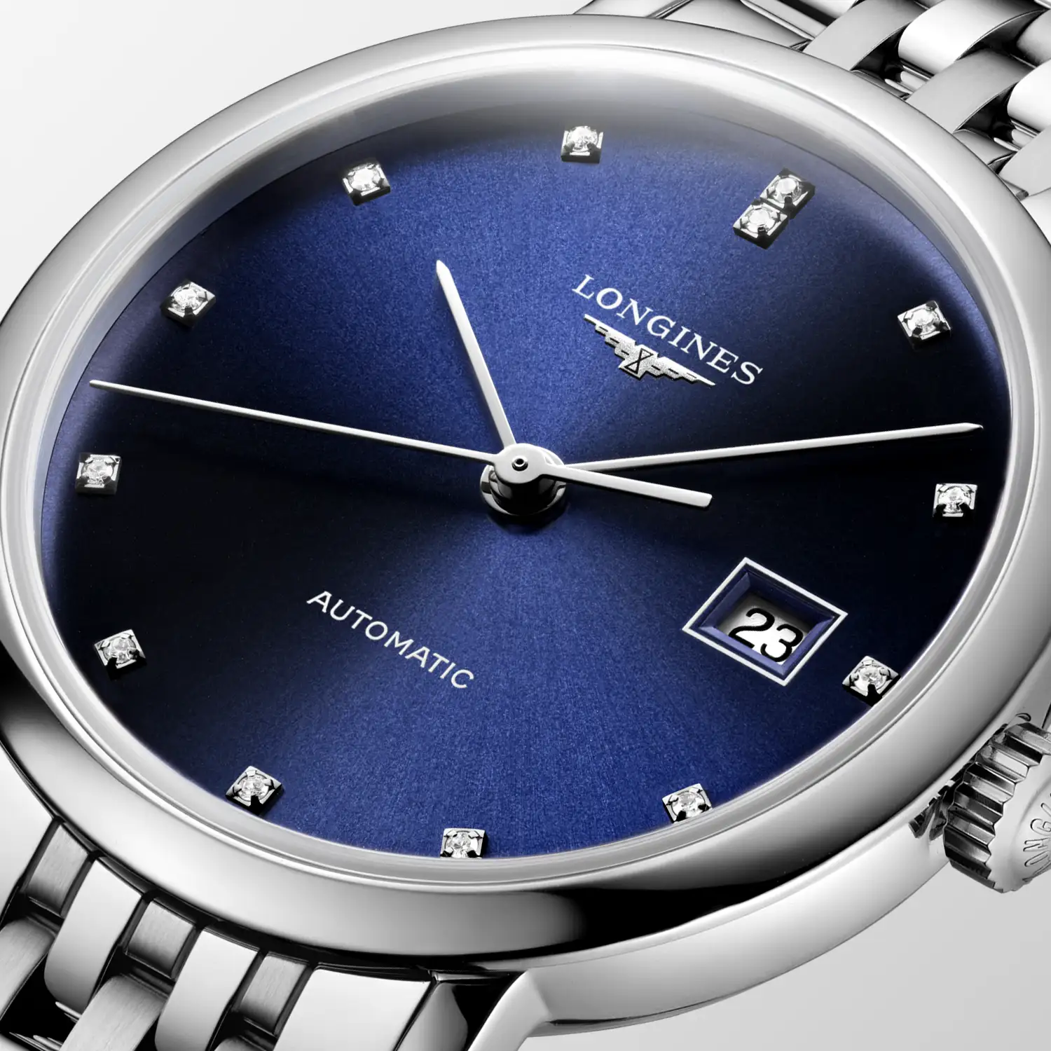 Z pozoru surowy, ale w rzeczywistości pełen kobiecego wyczucia stylu. Prezentowany automatyczny zegarek damski Longines Elegant Lady L4.310.4.90.6 to współczesna interpretacja ponadczasowej elegancji zakorzenionej w szwajcarskim zegarmistrzostwie. Subtelna koperta o średnicy 29 mm, zestawiona z klasyczną bransoletą ze stali szlachetnej, stanowi esencję wyważonego minimalizmu – bez zbędnych ozdobników, ale z charakterem. Czysta, niebieska tarcza z przepięknymi trzynastoma diamentami oraz precyzyjnym datownikiem wkomponowanym w godzinę trzecią to kompozycja, która nie potrzebuje dodatkowych słów – wystarczy spojrzenie.