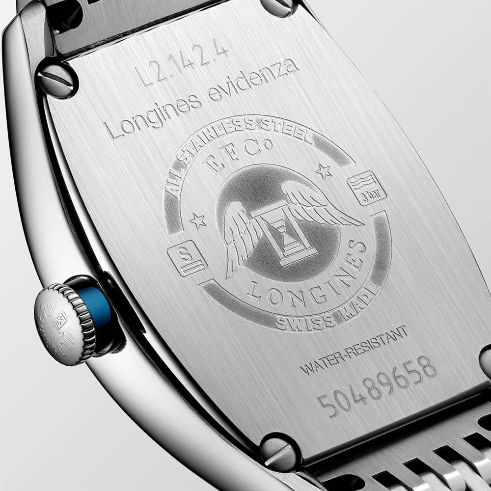 Damski zegarek Longines Evidenza L2.142.4.70.6 to wierny obraz wymienionego wyżej stylu, ówcześnie postrzeganego za przypływ nowoczesności, dziś natomiast za atrakcyjną ekspozycję niesamowitej konwencji retro. Prezentowany, automatyczny model uwiecznia 20-wieczną elegancję, oddając na nadgarstki Pań awangardową kopertę w kształcie "beczułki", abstrakcyjnie zakręcającą, rzymską skalę godzinową, niebieskie wskazówki ze stali oksydowanej, lśniącą tarczę zabezpieczoną antyrefleksyjnym szkłem szafirowym oraz pieczołowicie wypolerowaną, stalową (wysoce odporną na zarysowania i korozję) bransoletę z licznymi rzędami ogniw.