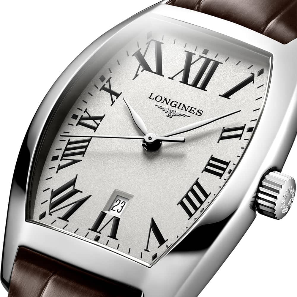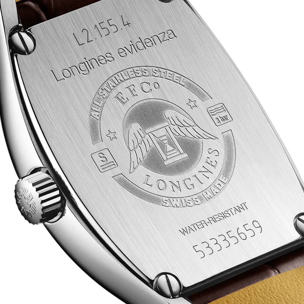 Damski czasomierz Longines Evidenza L2.155.4.71.5 to stalowa obudowa o rozmiarze 26.00 mm x 30.60 mm w kształcie beczki - tonneau, która uszczelniona jest do 30 metrów. Pod szkłem szafirowym niezwykle trudnym do zarysowania znajduje się cyferblat w kolorze srebrnym. Aktualną godzinę wskazują eleganckie wskazówki w kolorze srebrnym. Cyferblat cechuje przede wszystkim estetyka, ale i klasyczne wzornictwo. Na godzinie szóstej znalazło się miejsce na okienko datownika, które wskazuje aktualny dzień miesiąca. Do uszu zegarka przymocowany został elegancki egzotyczny pasek skórzany w kolorze brązowym. Pasek posiada bezpieczne zapięcie motylkowe na 2 przyciski. Pod cyferblatem ukrywa się mechanizm kwarcowy swiss made kaliber L152 z funkcją End of Life. Funkcja EoL poinformuje o konieczności wymiany baterii, gdy wskazówka zacznie przeskakiwać punkty co kilka sekund.