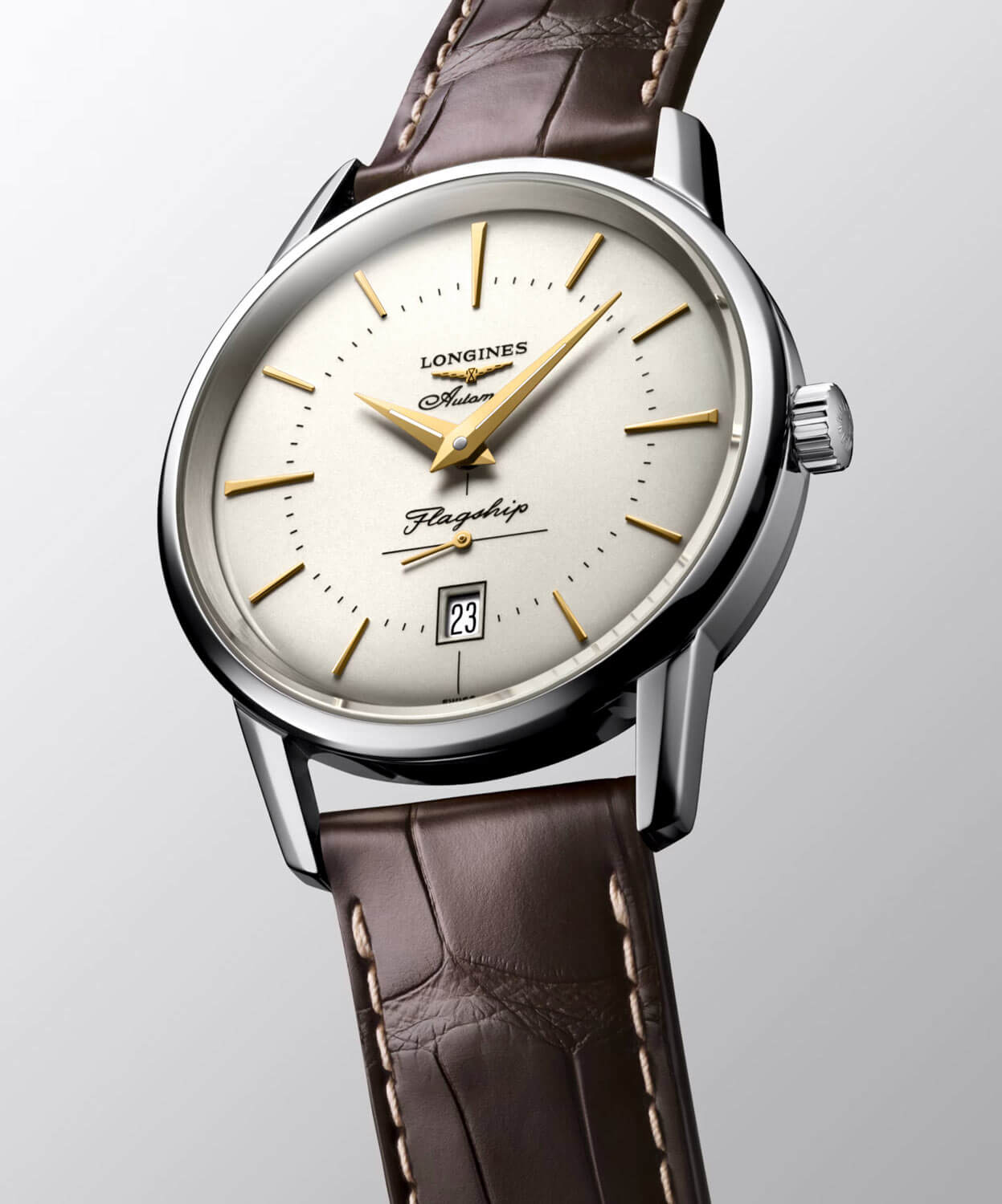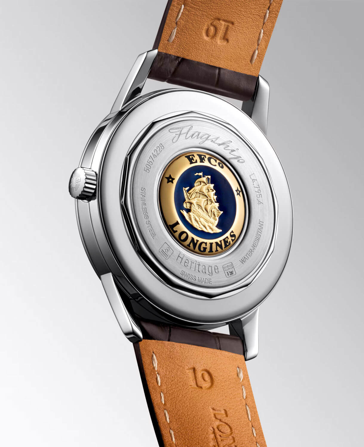 Zegarek męski Longines Flagship Heritage L4.795.4.78.2 jest jednym z klejnotów bogatego dziedzictwa Longines. Model o subtelnej i ponadczasowej konstrukcji, którego design zachwycił pierwszych klientów po raz pierwszy w 1957 roku. Flagship zawdzięcza swoją nazwę od statku kierowanego przez dowódcę floty, jest to flagowy zegarek w kolekcji Longines Heritage. Elegancki i klasyczny, zdecydowanie zachowuje estetykę vintage dzięki małemu sekundnikowi na godzinie szóstej. Czerpiąc inspirację z historycznego dzieła, Longines przedstawia jasną wersję Flagship Heritage. Kremowa, półbłyszcząca tarcza ukazuje nakładane indeksy i wskazówki w kolorze żółtego złota, a także oznaczenia w kolorze czarnym. Polerowana koperta o średnicy 38,50 mm z cienką ramką oraz uszami koperty jest zestawiona z brązowym paskiem z aligatora z białym przeszyciem. Od spodu zegarka znajduje się zakręcany dekiel z piękna pieczęcią przedstawiającą okręt Flagship. Sercem tego niezwykłego zegarka jest sprawdzony mechanizm automatyczny ETA 2895-2 z rezerwą chodu do około 50 godzin i 27 kamieni (jewels).