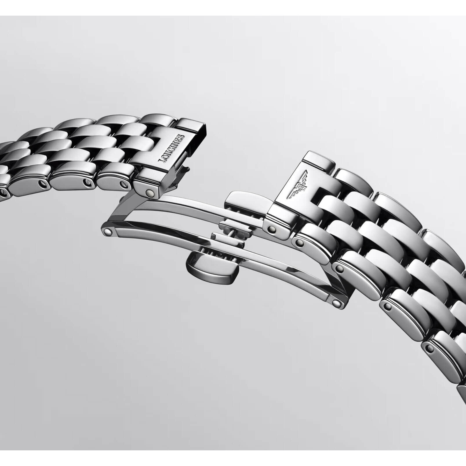 W smukłej obudowie w rozmiarze 30 mm pracuje mechanizm automatyczny Longines kaliber L592 o wysokiej częstotliwości 28 800 wahnięć na godzinę. Jego niezwykle ważnym elementem jest sprężyna balansu wykonana z monokrystalicznego krzemu – materiału odpornego na pola magnetyczne i zmiany temperatury. Dzięki temu mechanizm jest stabilny i precyzyjny, oferując do 45 godzin rezerwy chodu. Zegarek Longines od frontu zabezpieczony jest odpornym na zarysowania szkłem szafirowym z powłoką antyrefleksyjną od spodu. Rewers to transparentny dekiel, który pozwala podziwiać wahnik oraz pracę poszczególnych elementów mechanizmu.