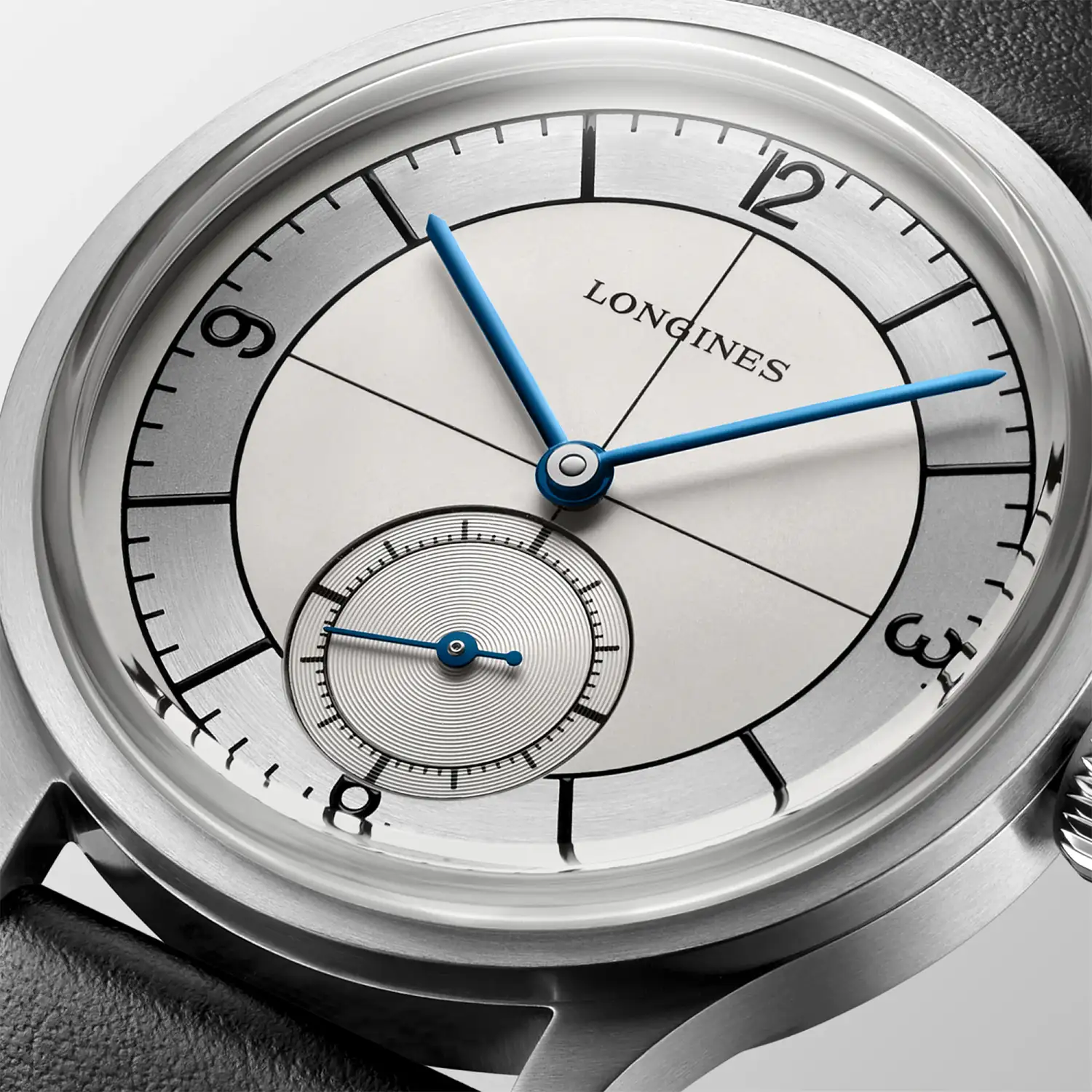 Tarcza stanowi najbardziej charakterystyczny element tego modelu i wyraźnie odwołuje się do historycznych wzorców marki. Srebrzysta powierzchnia została zaprojektowana w układzie sektorowym, z wyraźnym podziałem na strefy oraz subtelną małą sekundą umieszczoną na godzinie szóstej. Kontrastowe oznaczenia minutowe i arabskie indeksy zapewniają doskonałą czytelność, jednocześnie budując wyrafinowaną, techniczną estetykę.