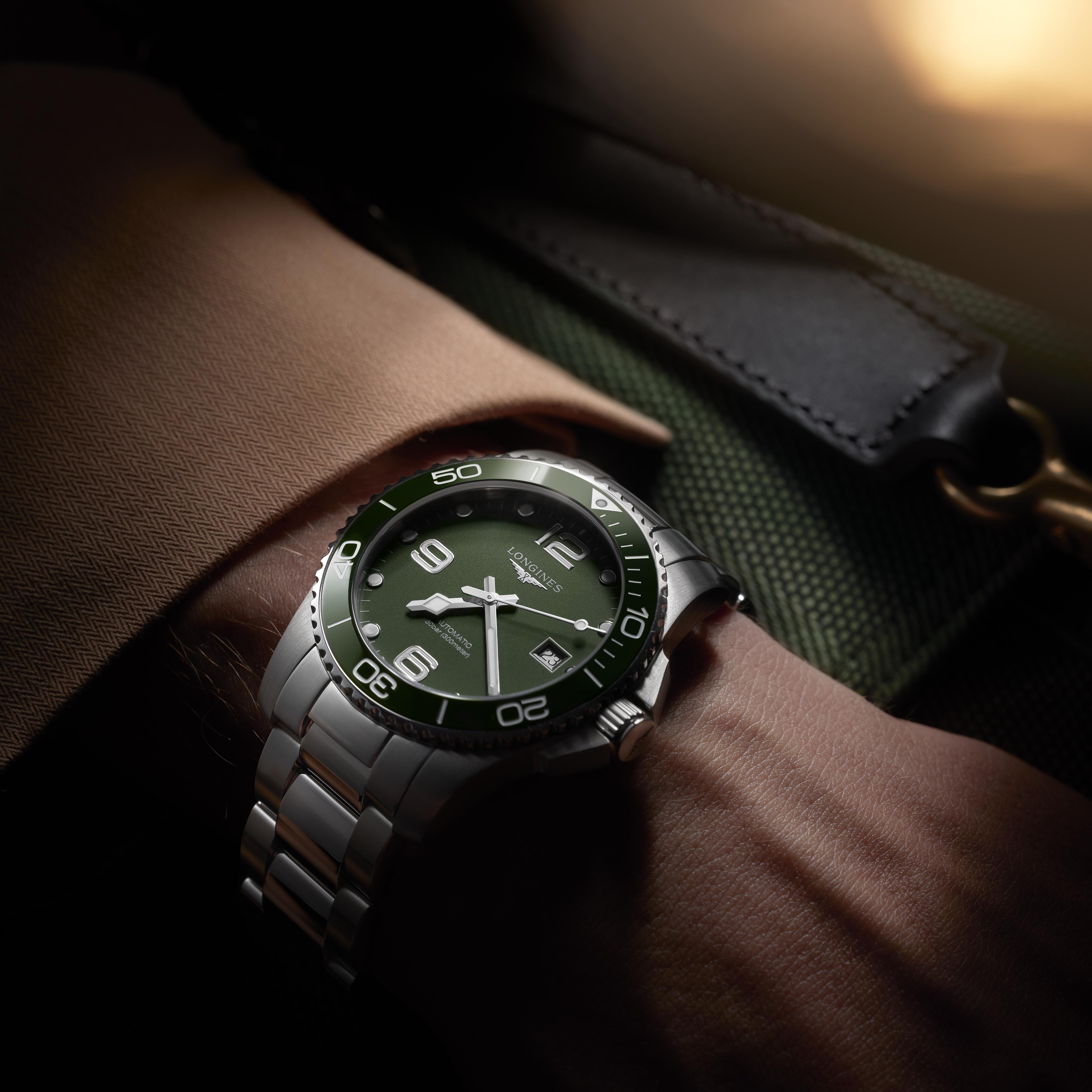 Kolekcja zegarków LONGINES HydroConquest wzbogacona została o dodatkowe wersje w odcieniach zieleni. W linii oferującej dotąd zegarki, w których dominował błękit, szarość i czerń, przedstawiamy nowy, zielony model czerpiący inspirację z fascynującego świata sportów wodnych. Wyposażone w pierścień lunety wzbogacony ceramiczną wstawką, podkreśla prestiż wzornictwa, blask i nowoczesny styl.