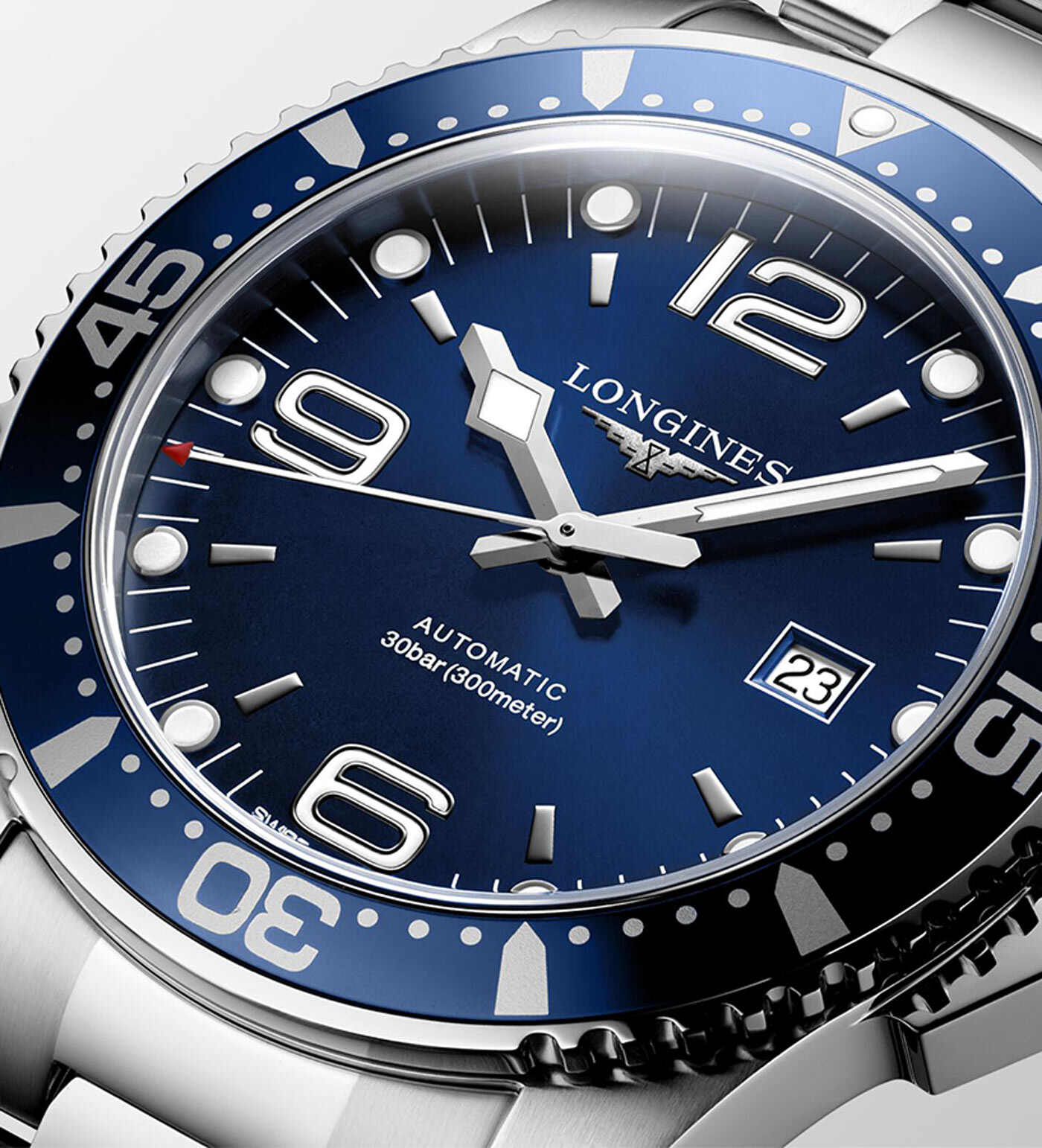 Kolejnym elementem chronometru nurkowego Longines jest szkło szafirowe z powłoką antyrefleksyjną po obu stronach. Wysoce odporne na zarysowania szkło przykrywa niebieską tarczę z dużymi czytelnymi wskazówkami i indeksami. Dzięki powłoce antyrefleksyjnej tarcza jest bardziej czytelna. Na godzinie trzeciej znajduje się okno datownika z aktualnym dniem miesiąca. W momencie gdy zabraknie światła aktualny czas pomoże odczytać szwajcarska masa luminescencyjna Super-LumiNova®, która znajduje się na wskazówkach, indeksach oraz na obrotowej lunecie na godzinie dwunastej.