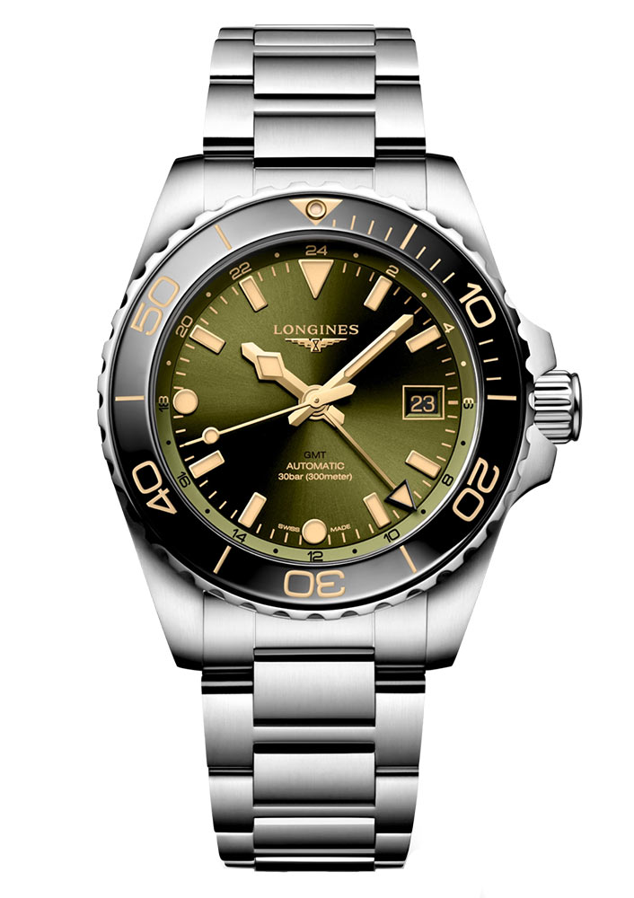 Kolejnym elementem chronometru nurkowego Longines jest szkło szafirowe z powłoką antyrefleksyjną po obu stronach. Wysoce odporne na zarysowania szkło przykrywa zieloną tarczę z dużymi czytelnymi wskazówkami i indeksami. Dzięki powłoce antyrefleksyjnej tarcza jest bardziej czytelna. Wskazówkom do wskazywania aktualnej godziny towarzyszy dodatkowa dedykowana dla funkcji GMT wskazówka z wykończeniem przypominającym grot strzały. Funkcja GMT to przydatna opcja dla Panów, których ważnym elementem w życiu, pracy jest podróż. Zegarek z funkcją GMT Longines pomoże z łatwością śledzić czas w innej strefie czasowej — aktualną godzinę w innej strefie czasowej odczytać można dzięki wspomnianej już dodatkowej wskazówce oraz skali godzinowej 24h, która znajduje się na zewnętrznej części tarczy. Na godzinie trzeciej znajduje się okno datownika z aktualnym dniem miesiąca. W momencie gdy zabraknie światła aktualny czas pomoże odczytać szwajcarska masa luminescencyjna Super-LumiNova®, która znajduje się na wskazówkach, indeksach oraz na obrotowej lunecie na godzinie dwunastej.