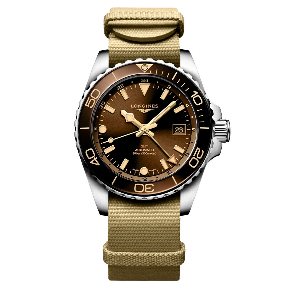 Kolejnym elementem chronometru nurkowego Longines jest szkło szafirowe z powłoką antyrefleksyjną po obu stronach. Wysoce odporne na zarysowania szkło przykrywa brązową tarczę ze słonecznym szlifem z dużymi czytelnymi wskazówkami i indeksami. Dzięki powłoce antyrefleksyjnej tarcza jest bardziej czytelna. Wskazówkom do wskazywania aktualnej godziny towarzyszy dodatkowa dedykowana dla funkcji GMT wskazówka z wykończeniem przypominającym grot strzały. Funkcja GMT to przydatna opcja dla Panów, których ważnym elementem w życiu, pracy jest podróż. Zegarek z funkcją GMT Longines pomoże z łatwością śledzić czas w innej strefie czasowej — aktualną godzinę w innej strefie czasowej odczytać można dzięki wspomnianej już dodatkowej wskazówce oraz skali godzinowej 24h, która znajduje się na zewnętrznej części tarczy. Na godzinie trzeciej znajduje się okno datownika z aktualnym dniem miesiąca. W momencie gdy zabraknie światła aktualny czas pomoże odczytać szwajcarska masa luminescencyjna Super-LumiNova®, która znajduje się na wskazówkach, indeksach oraz na obrotowej lunecie na godzinie dwunastej.