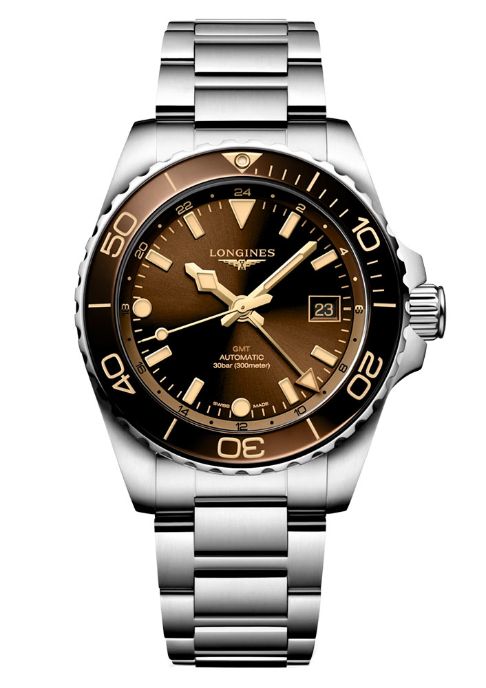 Kolejnym elementem chronometru nurkowego Longines jest szkło szafirowe z powłoką antyrefleksyjną po obu stronach. Wysoce odporne na zarysowania szkło przykrywa brązową tarczę z dużymi czytelnymi wskazówkami i indeksami. Dzięki powłoce antyrefleksyjnej tarcza jest bardziej czytelna. Wskazówkom do wskazywania aktualnej godziny towarzyszy dodatkowa dedykowana dla funkcji GMT wskazówka z wykończeniem przypominającym grot strzały. Funkcja GMT to przydatna opcja dla Panów, których ważnym elementem w życiu, pracy jest podróż. Zegarek z funkcją GMT Longines pomoże z łatwością śledzić czas w innej strefie czasowej — aktualną godzinę w innej strefie czasowej odczytać można dzięki wspomnianej już dodatkowej wskazówce oraz skali godzinowej 24h, która znajduje się na zewnętrznej części tarczy. Na godzinie trzeciej znajduje się okno datownika z aktualnym dniem miesiąca. W momencie gdy zabraknie światła aktualny czas pomoże odczytać szwajcarska masa luminescencyjna Super-LumiNova®, która znajduje się na wskazówkach, indeksach oraz na obrotowej lunecie na godzinie dwunastej.