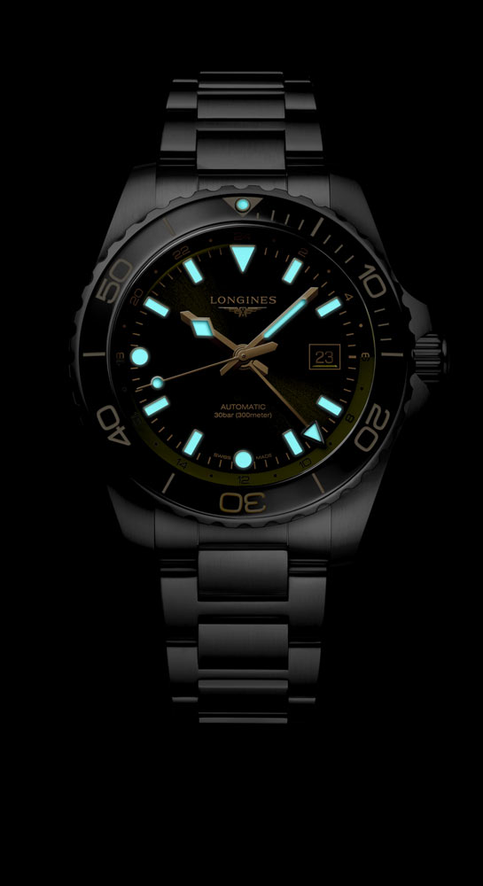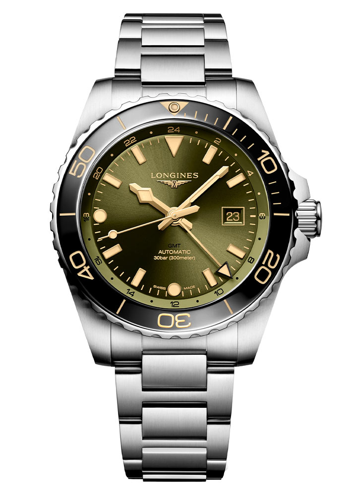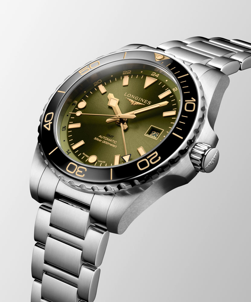 Zielona tarcza zegarka Longines HydroConquest GMT jest zabezpieczona szkłem szafirowym z wielowarstwową powłoką antyrefleksyjną. Dzięki substancji Super-LumiNova® indeksy godzin oraz wskazówki są doskonale widoczne nawet w nocy, zapewniając czytelność w każdych warunkach. Warto również zwrócić uwagę na funkcję GMT. Umożliwia ona śledzenie czasu w wielu strefach czasowych, co przyda się Panom, którzy często podróżują. Nie zabrakło również skali godzinowej 12/24h na pierścieniu wokół tarczy — odzwierciedla ona podział doby na dzień i noc.