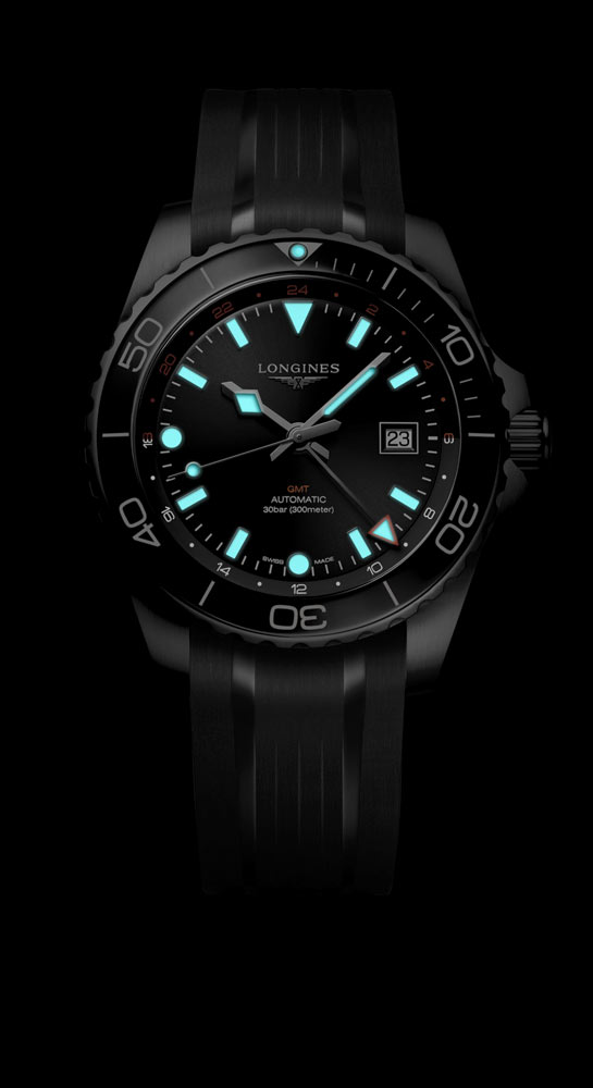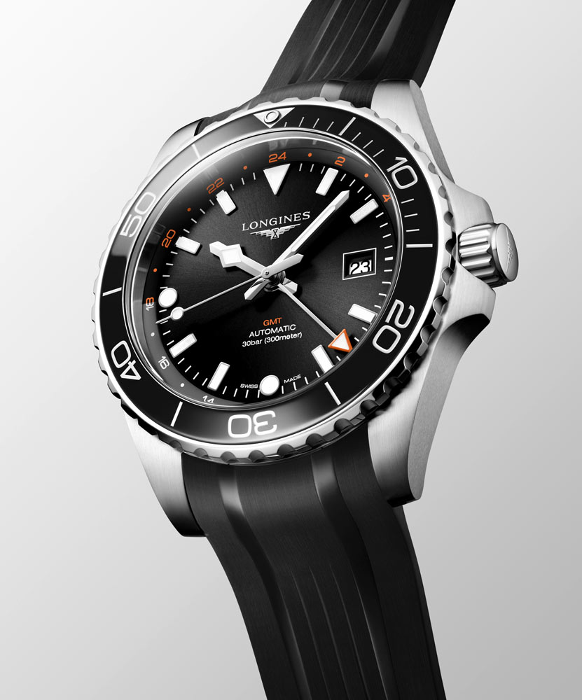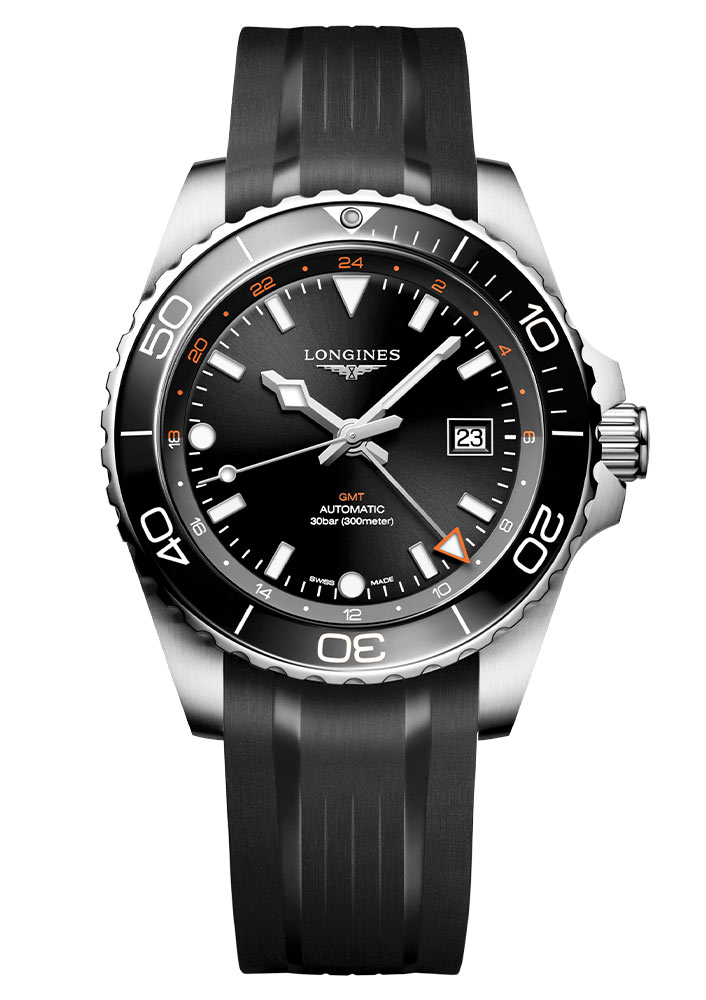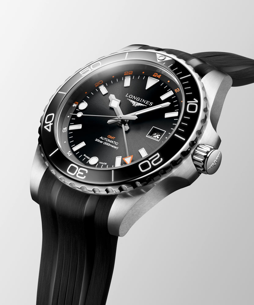 Czarna tarcza zegarka Longines HydroConquest GMT jest zabezpieczona szkłem szafirowym z wielowarstwową powłoką antyrefleksyjną. Dzięki substancji Super-LumiNova® indeksy godzin oraz wskazówki są doskonale widoczne nawet w nocy, zapewniając czytelność w każdych warunkach. Warto również zwrócić uwagę na funkcję GMT. Umożliwia ona śledzenie czasu w wielu strefach czasowych, co przyda się Panom, którzy często podróżują. Nie zabrakło również skali godzinowej 12/24h na pierścieniu wokół tarczy — odzwierciedla ona podział doby na dzień i noc.