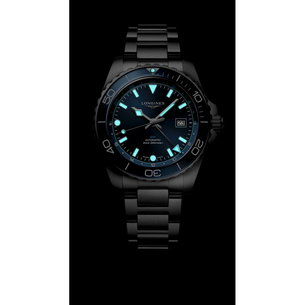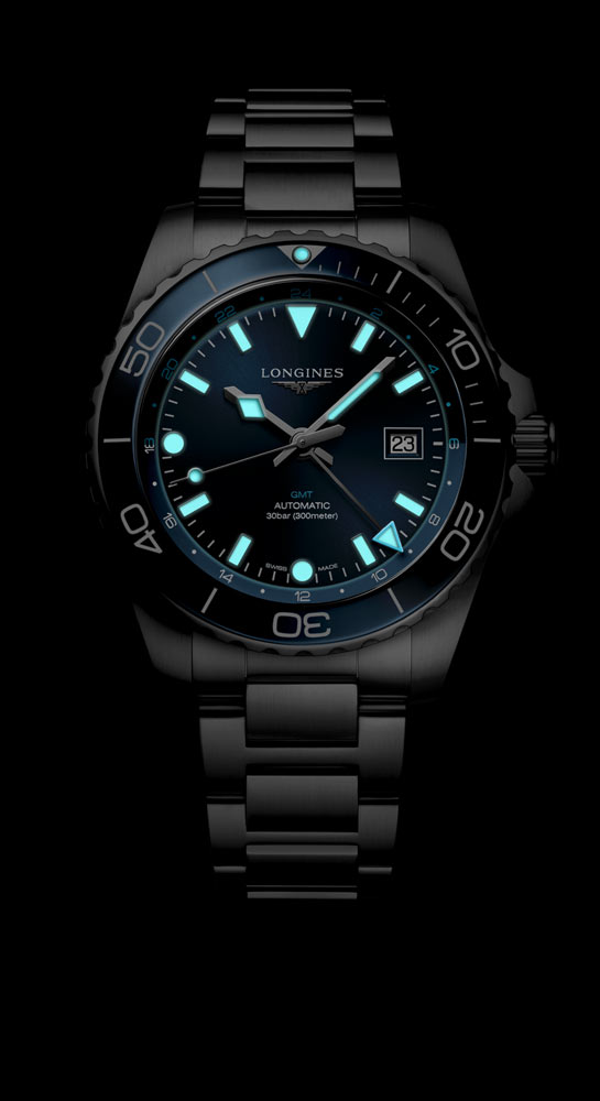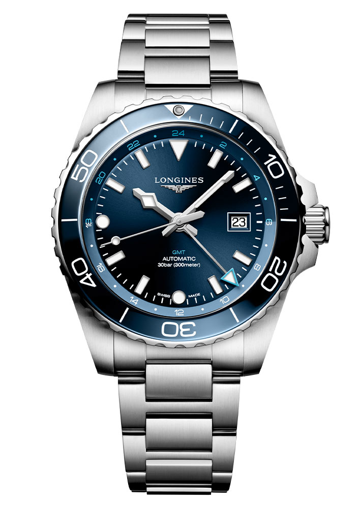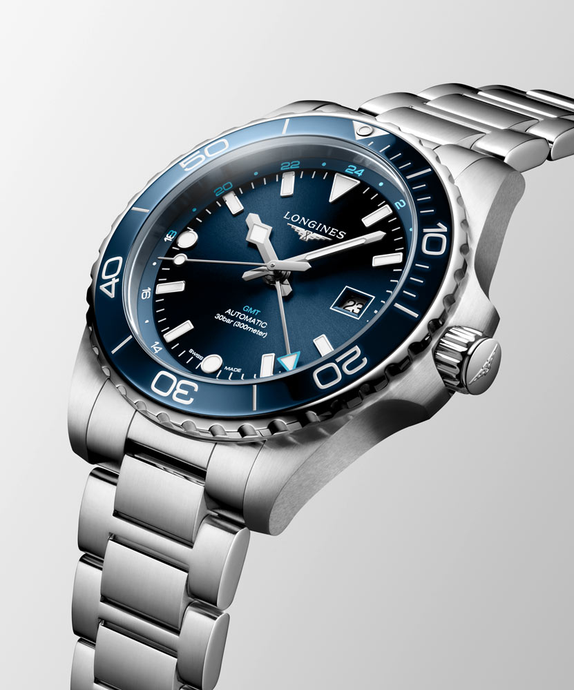 Niebieska tarcza zegarka Longines HydroConquest GMT jest zabezpieczona szkłem szafirowym z wielowarstwową powłoką antyrefleksyjną. Dzięki substancji Super-LumiNova® indeksy godzin oraz wskazówki są doskonale widoczne nawet w nocy, zapewniając czytelność w każdych warunkach. Warto również zwrócić uwagę na funkcję GMT. Umożliwia ona śledzenie czasu w wielu strefach czasowych, co przyda się Panom, którzy często podróżują. Nie zabrakło również skali godzinowej 12/24h na pierścieniu wokół tarczy — odzwierciedla ona podział doby na dzień i noc.