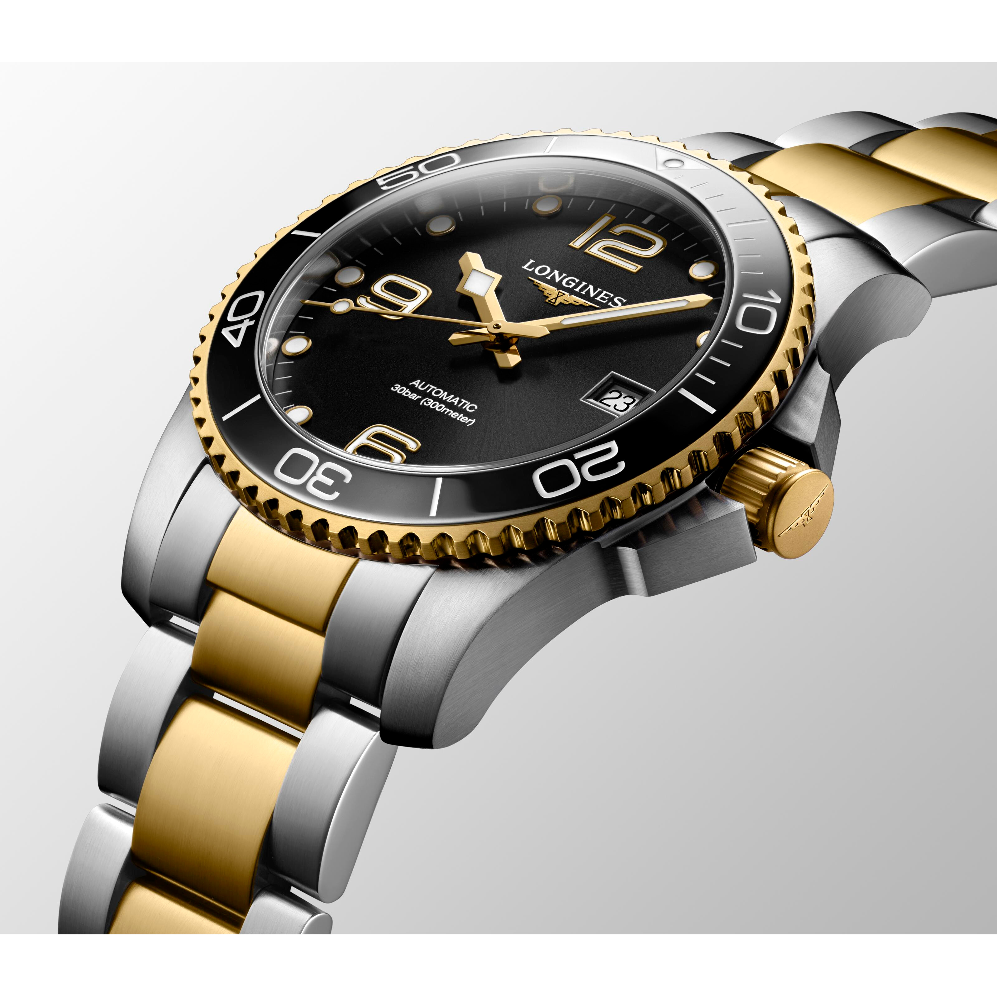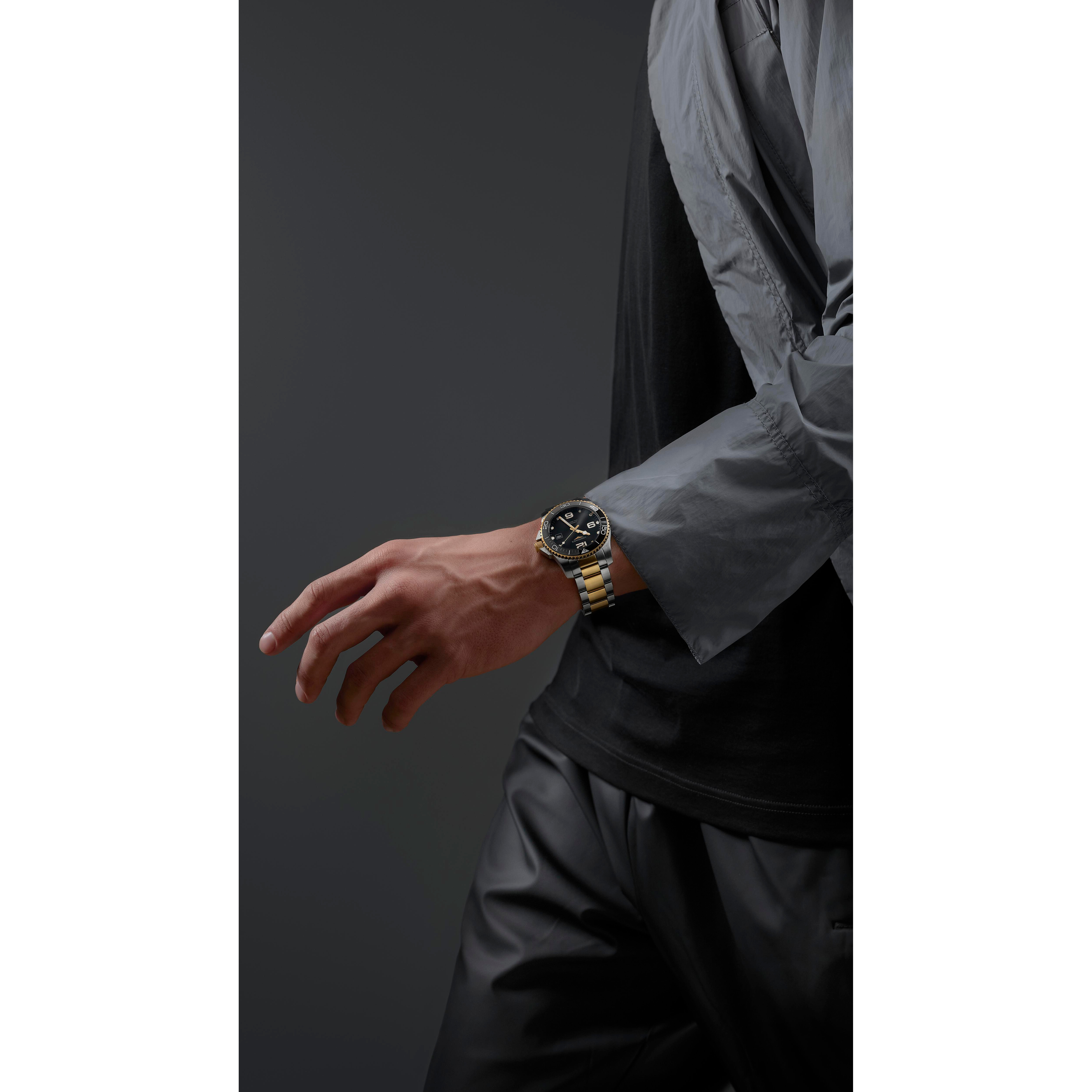 Longines HydroConquest L3.781.3.56.7 to czasomierz, który z powodzeniem zaspokoi, a nawet przewyższy oczekiwania zarówno miłośników miejskiej, jak i podwodnej eksploracji. Estetyczny i wysoce luksusowy design stanowiący połączenie szczotkowanej stali, warstwy żółtego złota PVD oraz połyskującej czerni tarczy doskonale wpisze się w preferencje Panów gustujących w nieprzeciętnych dodatkach sportowych. Duże, arabskie bądź punktowe oznaczenia godzin oraz oryginalny projekt wskazówek (oba komponenty pokryte szwajcarską Super-LumiNovą®), obrotowy bezel nurkowy z eleganckiej i odpornej na zarysowania ceramiki, a także wysoka wodoszczelność pozwalająca na nurkowanie z zegarkiem nawet do 300 m w głąb, sprostają z kolei wymaganiom mężczyzn odczuwających potrzebę zwiedzania i/lub badania świata pod wodą.