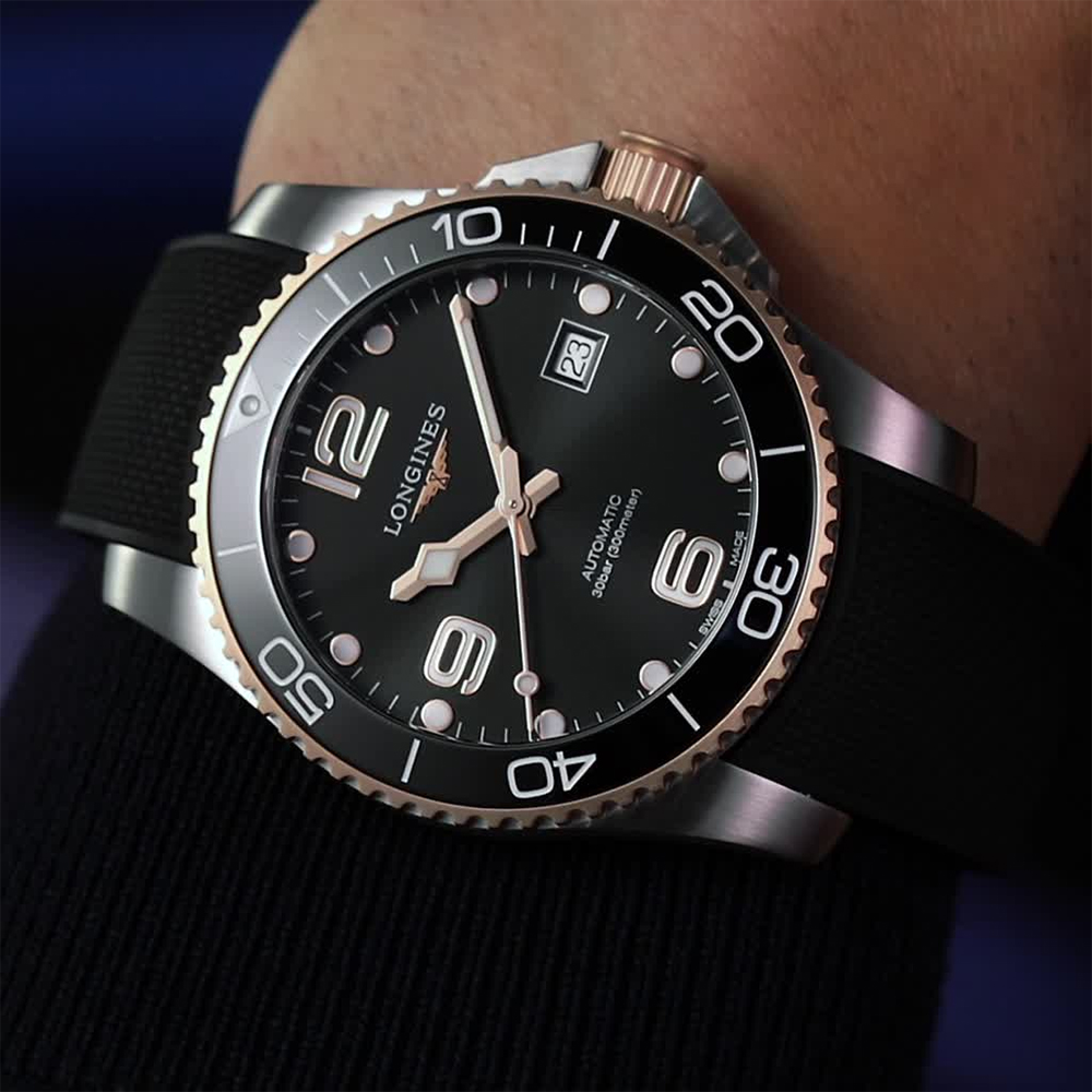 Longines HydroConquest L3.781.3.58.9 to czasomierz, który z powodzeniem zaspokoi, a nawet przewyższy oczekiwania zarówno miłośników miejskiej, jak i podwodnej eksploracji. Estetyczny i wysoce luksusowy design stanowiący połączenie szczotkowanej stali, warstwy różowego złota PVD oraz połyskującej na czarno tarczy i czarnego, gumowego paska doskonale wpisze się w preferencje Panów gustujących w nieprzeciętnych dodatkach sportowych. Duże, arabskie bądź punktowe oznaczenia godzin oraz oryginalny projekt wskazówek (oba komponenty pokryte szwajcarską Super-LumiNovą®), obrotowy bezel nurkowy z eleganckiej i odpornej na zarysowania ceramiki, a także wysoka wodoszczelność pozwalająca na nurkowanie z zegarkiem nawet do 300 m w głąb, sprostają z kolei wymaganiom mężczyzn odczuwających potrzebę zwiedzania i/lub badania świata pod wodą.