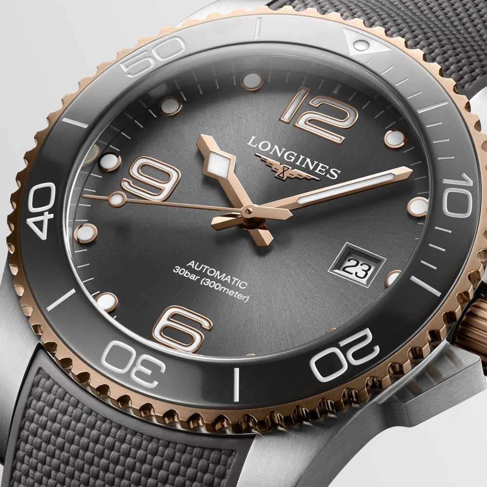 Longines HydroConquest L3.781.3.78.9 to czasomierz, który z powodzeniem zaspokoi, a nawet przewyższy oczekiwania zarówno miłośników miejskiej, jak i podwodnej eksploracji. Estetyczny i wysoce luksusowy design stanowiący połączenie szczotkowanej stali, warstwy różowego złota PVD oraz połyskującej tarczy i gumowego paska w szarym odcieniu doskonale wpisze się w preferencje Panów gustujących w nieprzeciętnych dodatkach sportowych. Duże, arabskie bądź punktowe oznaczenia godzin oraz oryginalny projekt wskazówek (oba komponenty pokryte szwajcarską Super-LumiNovą®), obrotowy bezel nurkowy z eleganckiej i odpornej na zarysowania ceramiki, a także wysoka wodoszczelność pozwalająca na nurkowanie z zegarkiem nawet do 300 m w głąb, sprostają z kolei wymaganiom mężczyzn odczuwających potrzebę zwiedzania i/lub badania świata pod wodą.