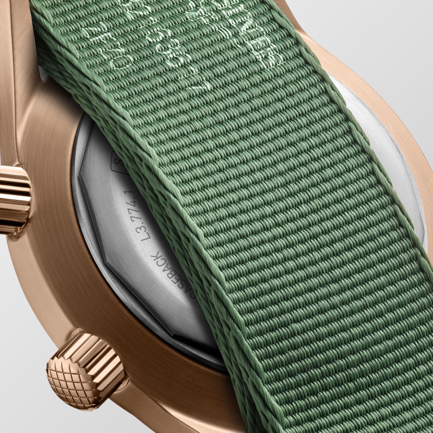 Współczesny Longines Legend Diver Bronze bardzo szczegółowo odwzorowuje pierwotny model z 1960 roku. Ten sam rozmiar koperty 42 mm idealnie wpisuje się we współczesne trendy. Wypukłe szkło szafirowe z antyrefleksem, pozwala na wygodne użytkowanie zegarka także do stroju bardziej formalnego. Legend Diver mimo swojego „nurkowego” rodowodu dobrze komponuje się z mankietem eleganckiej koszuli. Dwie koronki znajdują się tradycyjnie po prawej stronie koperty i są również wykonane z brązu. Obie zakręcane na gwint wraz z zakręcanym, tytanowym deklem zapewniają wodoszczelność klasy 30 bar/300 m. Zielona tarcza z gradientem ukazuje matowe wskazówki w kolorze brązu z wypełnieniem zieloną substancją luminescencyjną. Zegarek prezentowany jest na ciemnobrązowym pasku skórzanym z beżowym szyciem. Legend Diver Watch Bronze zawiera dodatkowy, zielony pasek NATO, który idealnie pasuje do tarczy i pozwala noszącemu zmienić wygląd zegarka w zależności od jego nastroju. Specjalne pudełko zawiera narzędzie do zmiany paska.