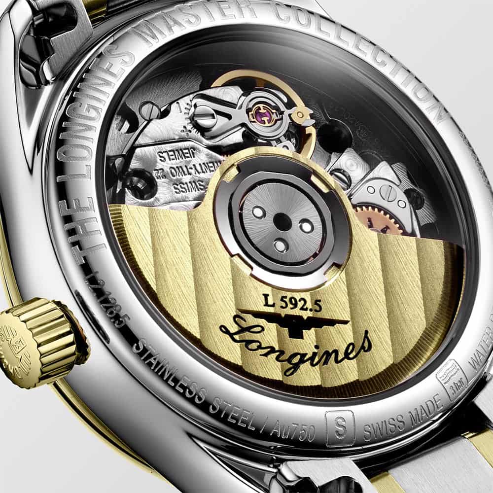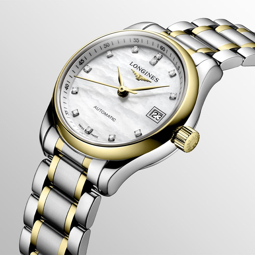 Koperta zegarka wykonana jest ze stali szlachetnej o średnicy 25.50 mm i uszczelniona została do 30 metrów. Front koperty wzbogacony został o bezel wykonany z 18k złota. Na perłowej tarczy naniesione są indeksy godzin w postaci 12 diamentów 0.034 ct, a także datownik z aktualnym dniem miesiąca na pozycji trzeciej. Całość chroniona jest przez szkło szafirowe wysoce odporne na zarysowania i uszkodzenia. Wewnątrz koperty znajduje się mechanizm automatyczny kaliber L592, który gwarantuje precyzyjny pomiar czasu oraz rezerwę chodu do 45 godzin. Czasomierz Longines Master Collection zestawiony został z bransoletą stalową w kolorze srebrnym. Do bransolety dodano małe ogniwa wykonane z 18k złota. Wygodę i bezpieczeństwo zapewni zapięcie motylkowe.