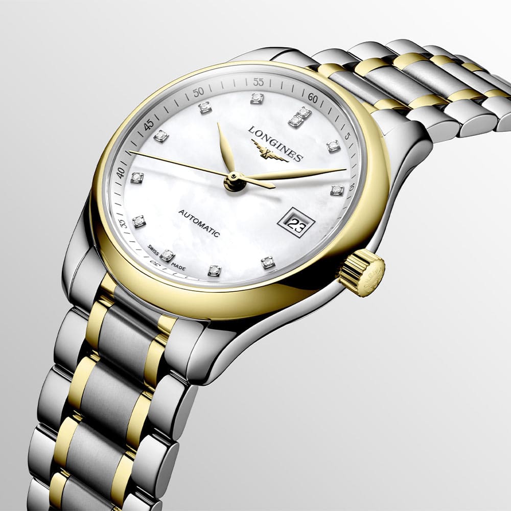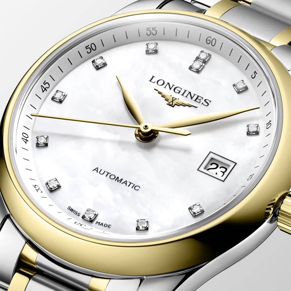 Koperta zegarka wykonana jest ze stali szlachetnej o średnicy 29 mm i uszczelniona została do 30 metrów. Front koperty wzbogacony został o bezel wykonany z 18k złota. Na perłowej tarczy naniesione są indeksy godzin w postaci 12 diamentów 0.034 ct, a także datownik z aktualnym dniem miesiąca na pozycji trzeciej. Całość chroniona jest przez szkło szafirowe wysoce odporne na zarysowania i uszkodzenia. Wewnątrz koperty znajduje się mechanizm automatyczny kaliber L592, który gwarantuje precyzyjny pomiar czasu oraz rezerwę chodu do 45 godzin. Czasomierz Longines Master Collection zestawiony został z bransoletą stalową w kolorze srebrnym. Do bransolety dodano małe ogniwa wykonane z 18k złota. Wygodę i bezpieczeństwo zapewni zapięcie motylkowe.