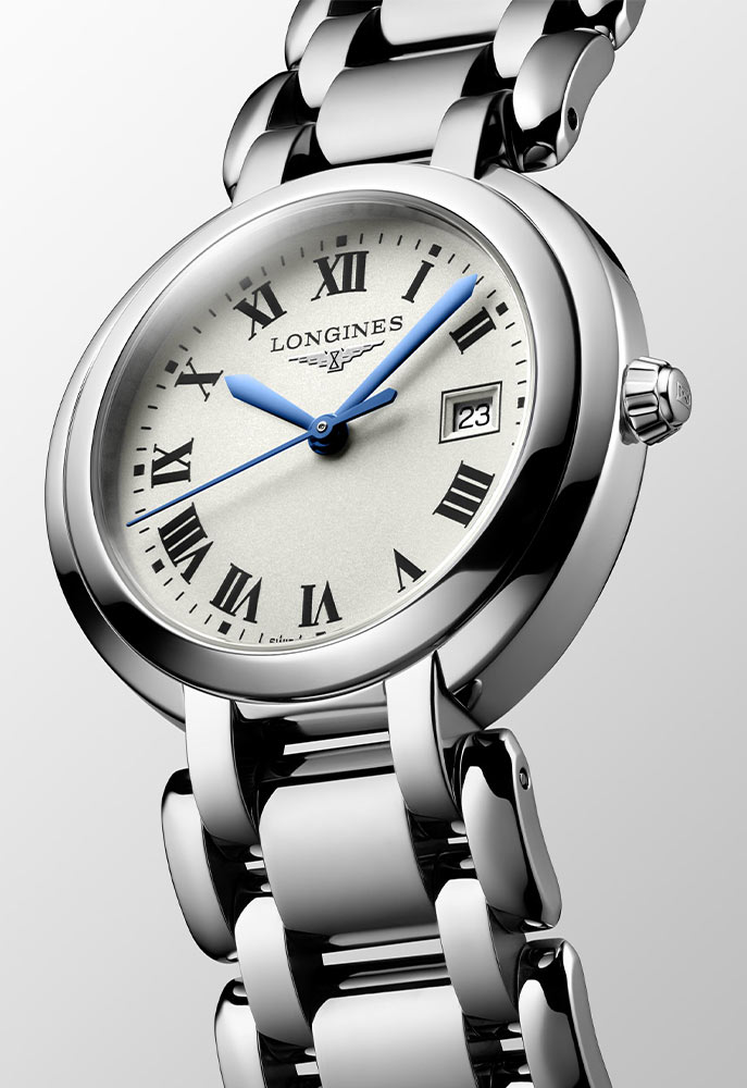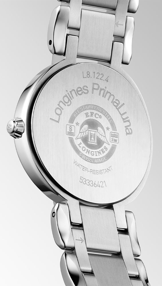 Longines PrimaLuna to okrągła koperta wykonana ze stali szlachetnej w rozmiarze 30 mm. Na prawej stronie umieszczono wygodną w obsłudze, elegancką koronkę. Obudowa uszczelniona została do 30 metrów. Do uszu przymocowano stalową bransoletę w kolorze srebrnym z bezpiecznym i wygodnym zapięciem motylkowym. Wysoce odporne na zarysowania szkło szafirowe z powłoką antyrefleksyjną przykrywa srebrną tarczę z cyframi rzymskimi i eleganckimi niebieskimi wskazówkami. Na godzinie trzeciej znalazł się mały datownik z aktualnym dniem miesiąca. Pod tarczą zegarka Longines ukryty jest mechanizm kwarcowy — producent wyposażył czasomierz w dokładny kaliber L152 z funkcją End of Life. EOL poinformuje właścicielkę czasomierza o konieczności wymiany baterii, która zasila ten model.