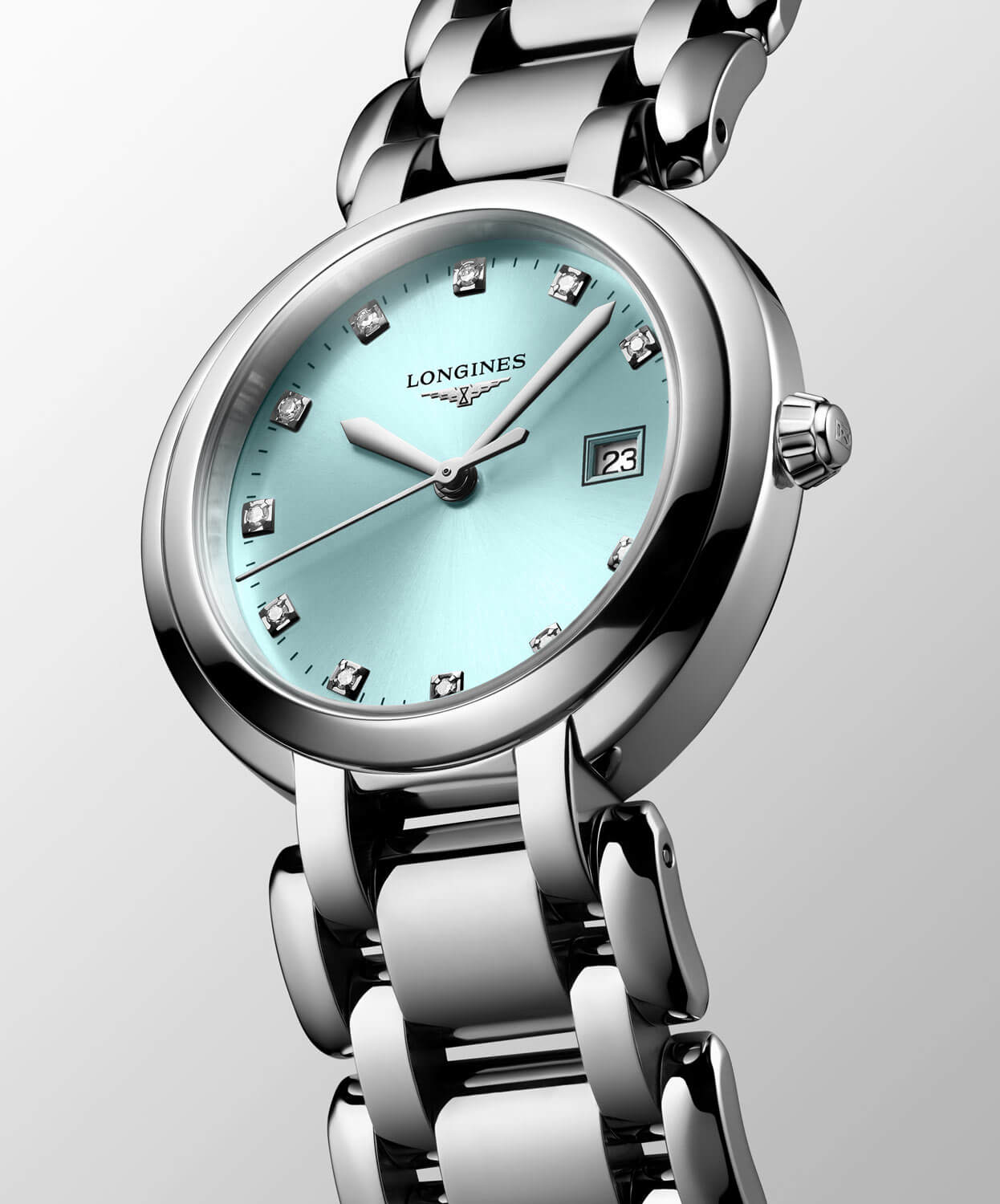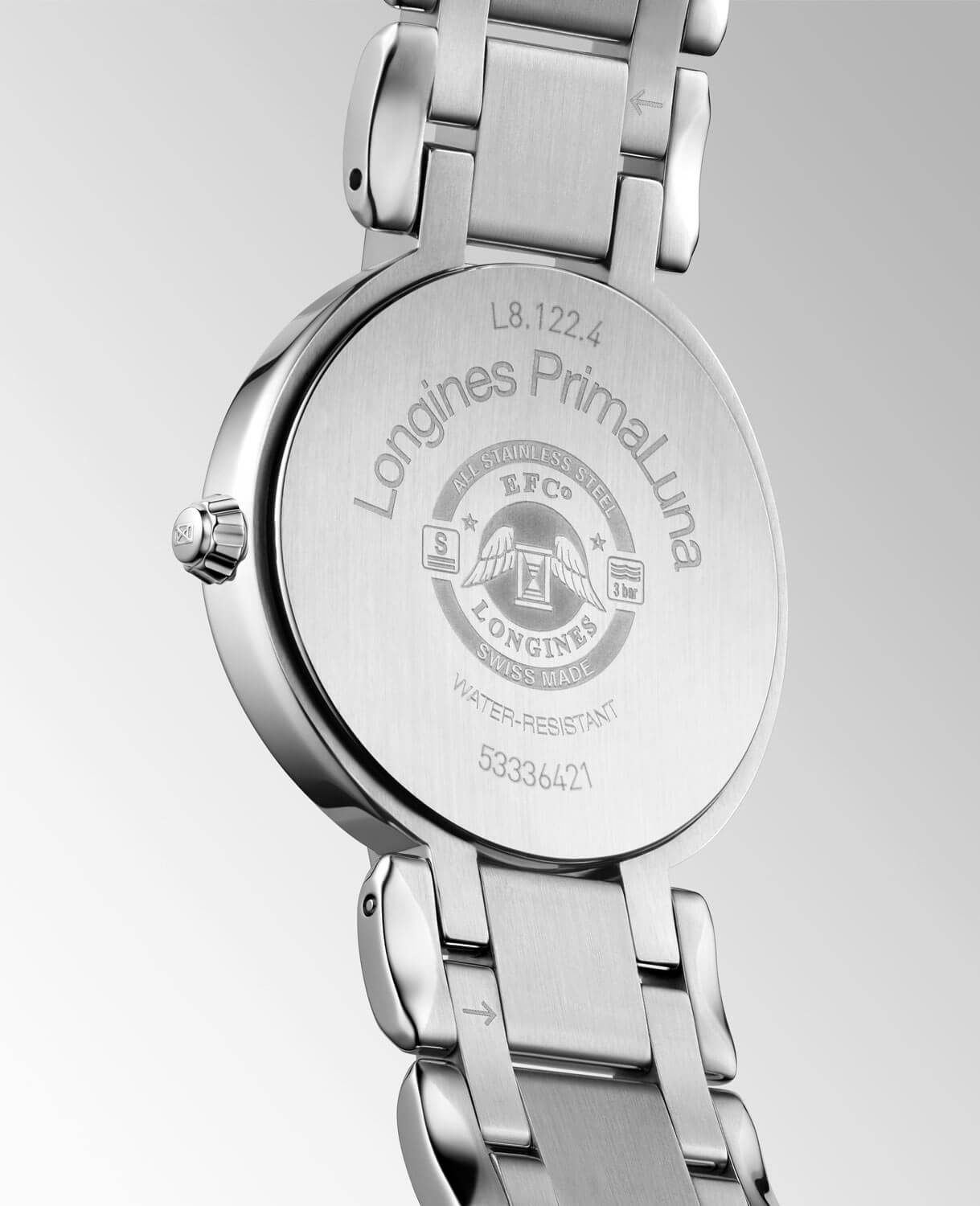 Srebrny zegarek damski z prawdziwymi diamentami Longines PrimaLuna L8.122.4.90.6 ma 30-milimetrową kopertę ze stali szlachetnej. Po prawej stronie umieszczona jest wygodna w obsłudze, elegancka koronka. Cała obudowa jest wodoszczelna do 30 metrów. Do uszu przymocowana jest wielorzędowa, stalowa bransoleta w kolorze srebrnym z bezpiecznym i wygodnym zapięciem motylkowym. Wysoce odporne na zarysowania szkło szafirowe z powłoką antyrefleksyjną przykrywa szlifowaną, turkusową tarczę z 11 diamentami Top Wesselton o łącznej masie 0,044ct. Na godzinie trzeciej znajduje się drobny datownik z aktualnym dniem miesiąca. Wskazówki są wypolerowane. Pod tarczą zegarka Longines skryty jest szwajcarski mechanizm kwarcowy. Jego kaliber o oznaczeniu L152 cechuje imponująca precyzja oraz przydatna funkcja EOL (End Of Life). EOL poinformuje właścicielkę czasomierza o wyczerpującej się baterii.