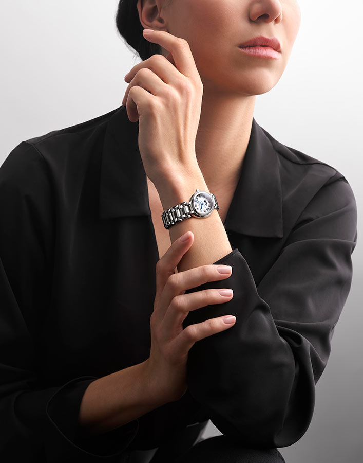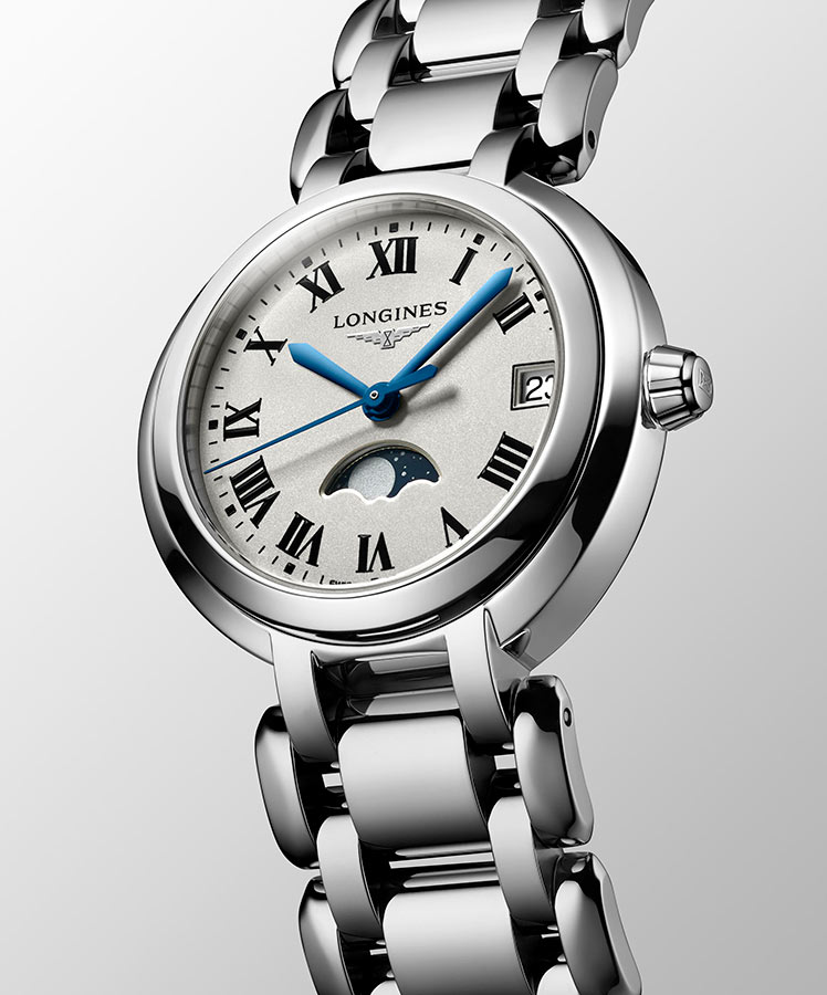 Longines PrimaLuna Moon Phase L8.115.4.71.6 dodatkowa gwiazda w kolekcji Primaluna. Okrągłe, delikatne linie i funkcja faz księżyca w zegarku Longines PrimaLuna Moon Phase są hołdem dla srebrnej gwiazdy. Delikatna sylwetka została uwydatniona przez wytworną, elegancką tarczę, a całość podkreśla niesamowity księżyc na niebieskim tle umiejscowiony na godzinie szóstej. Wdzięczny, magiczny model uwodzi kobiety, które doceniają ponadczasową, wyrafinowaną elegancję. Wygładzone kształty i ruchome ogniwa bransolety sprawiają uczucie luksusu podczas noszenia.