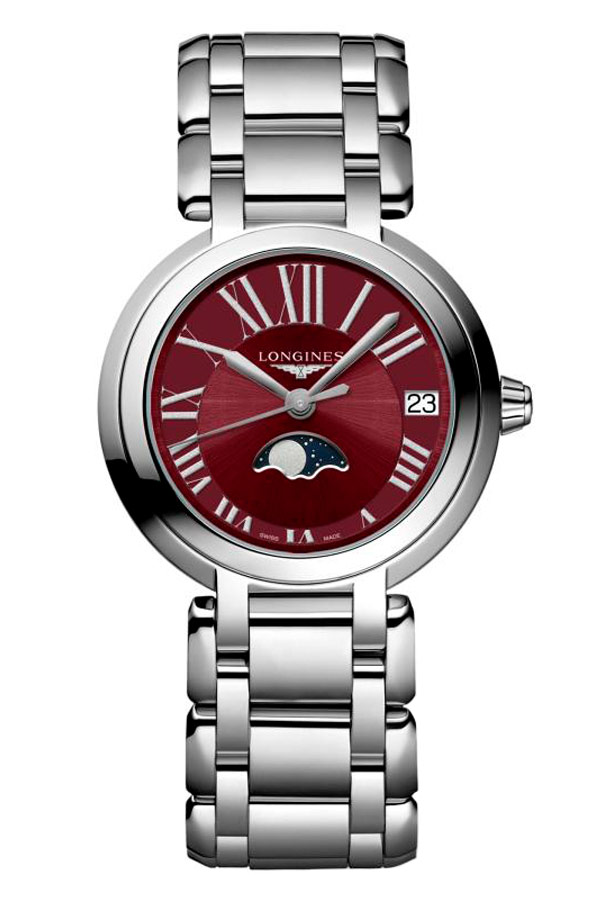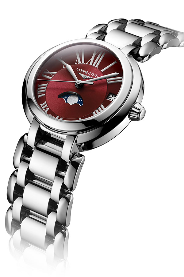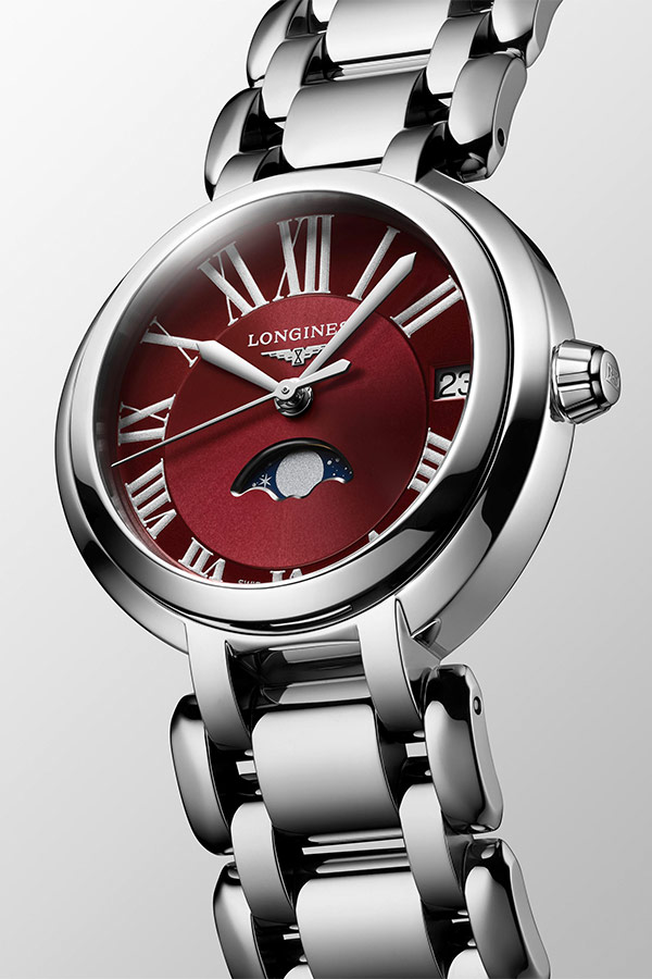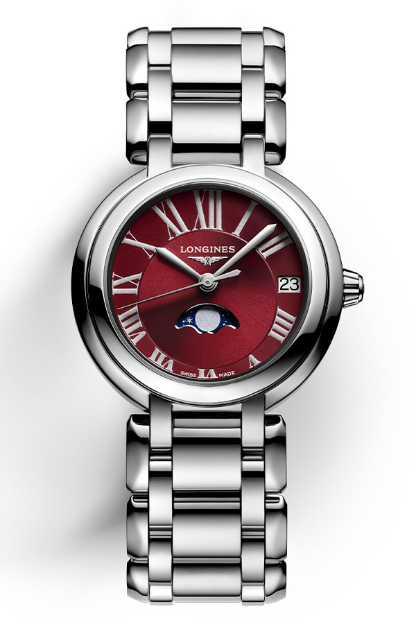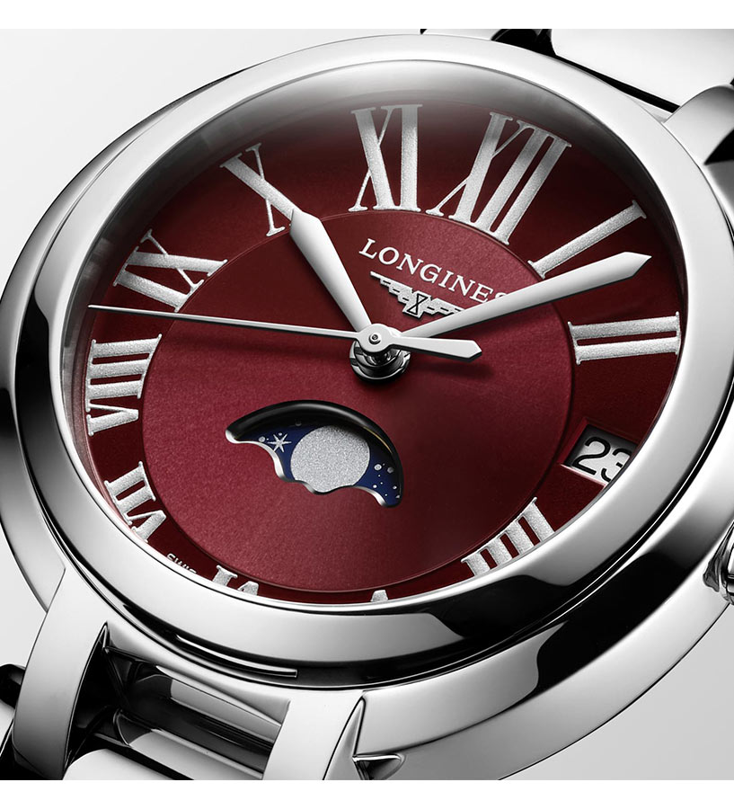 Longines PrimaLuna Moon Phase L8.115.4.92.6 dodatkowa gwiazda w kolekcji szwajcarskiej marki. Okrągłe, delikatne linie i funkcja faz księżyca w zegarku Longines PrimaLuna Moon Phase są hołdem dla srebrnej gwiazdy. Delikatna sylwetka została uwydatniona przez wytworną, elegancką tarczę w kolorze czerwonym, a całość podkreśla niesamowity księżyc na niebieskim tle umiejscowiony na godzinie szóstej. Wdzięczny, magiczny model uwodzi kobiety, które doceniają ponadczasową, wyrafinowaną elegancję. Wygładzone kształty i ruchome ogniwa bransolety sprawiają uczucie luksusu podczas noszenia.
