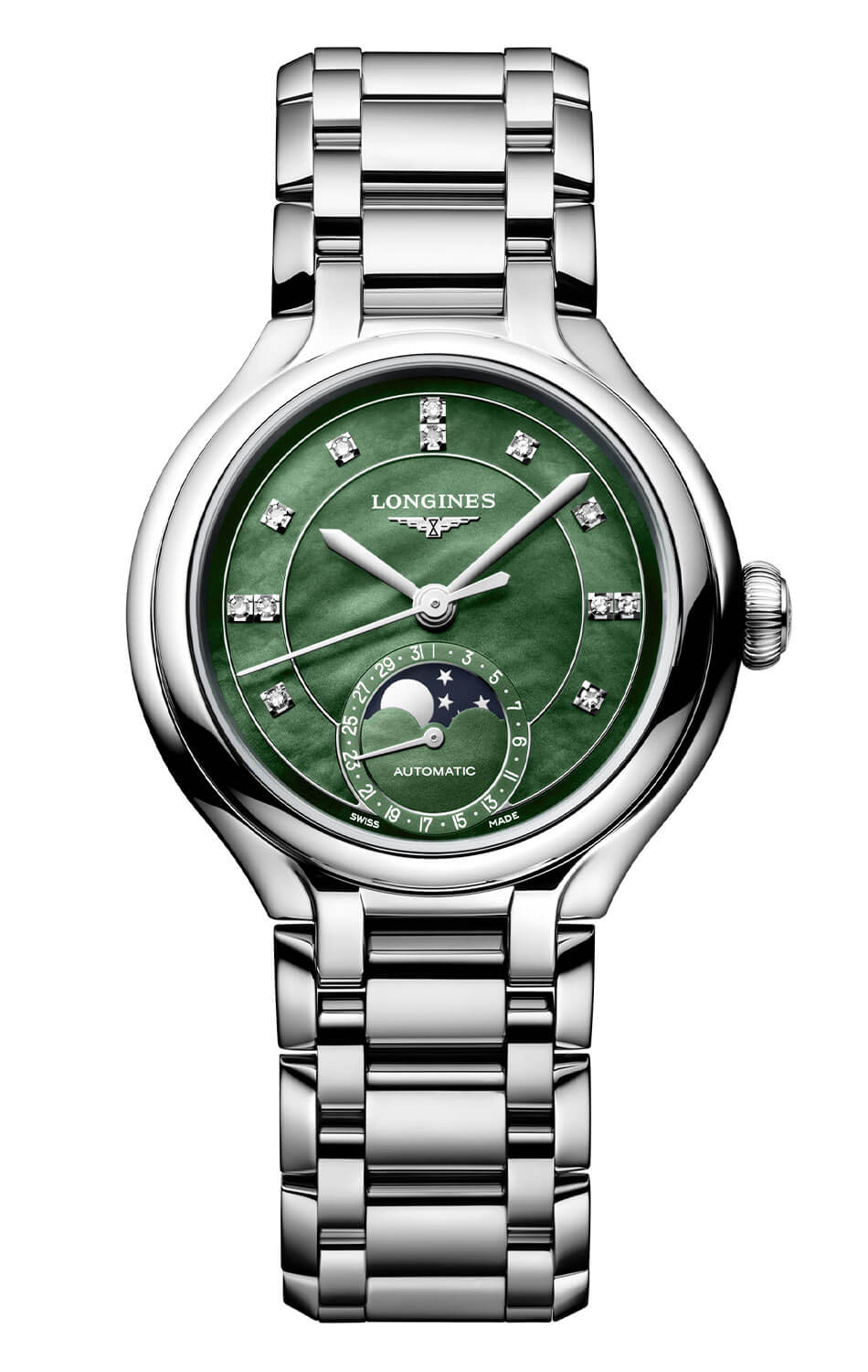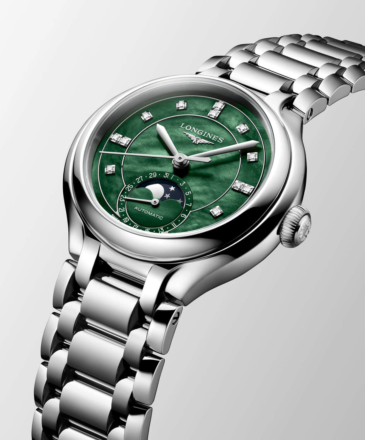 Damski zegarek automatyczny Longines PrimaLuna Moonphase L8.126.4.07.6 to propozycja stworzona z myślą o kobietach, które cenią subtelną elegancję i ponadczasowy styl. Harmonijna linia koperty o średnicy 34 mm została zestawiona z pełną blasku stalową bransoletą, która płynnie integruje się z obudową, tworząc wyważoną kompozycję o biżuteryjnym wykończeniu. Zielona tarcza z masy perłowej oraz naturalne diamenty podkreślają wyjątkowość modelu i sprawiają, że doskonale odnajduje się zarówno na co dzień, jak i podczas wyjątkowych okazji.