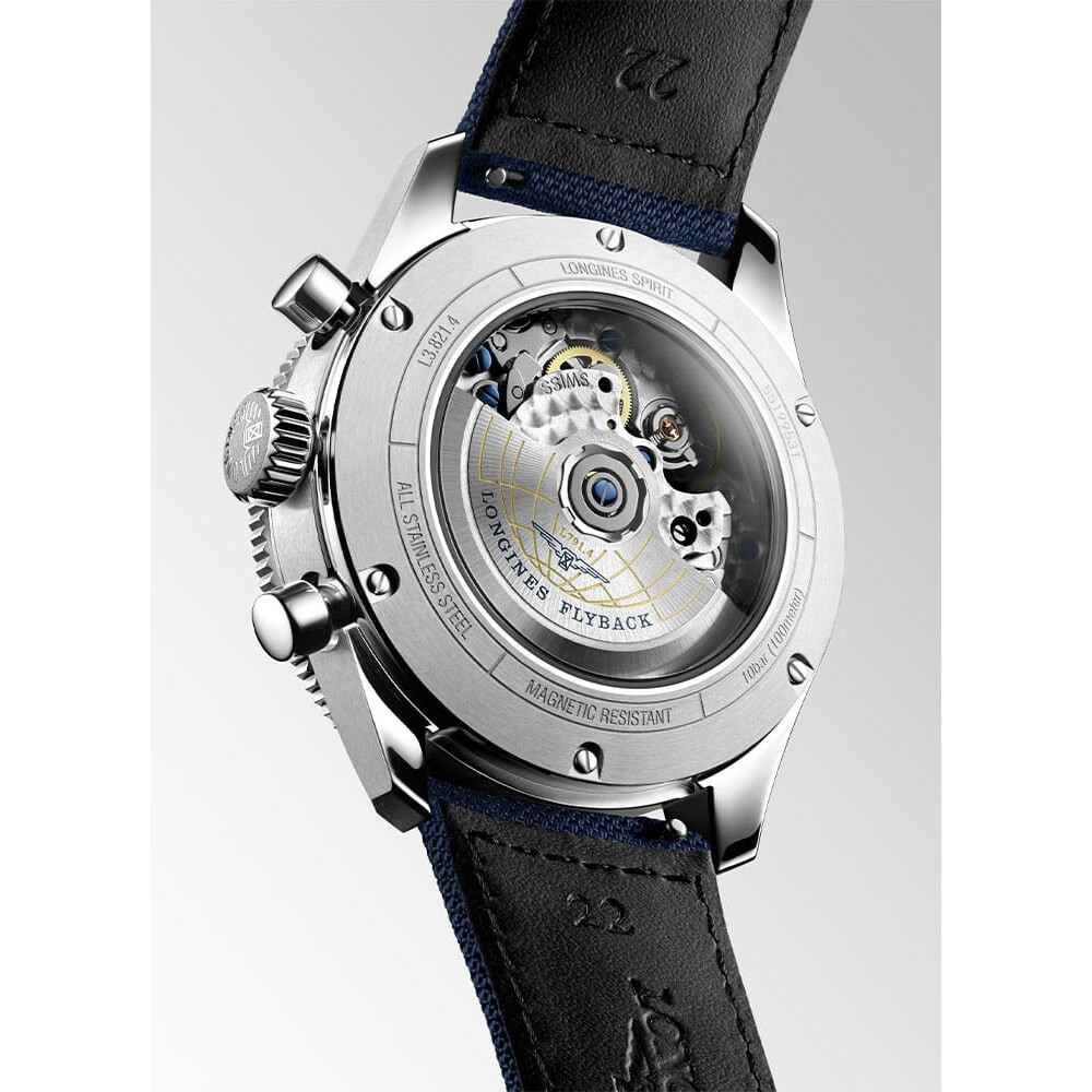 Do uszu obudowy przymocowany został pasek materiałowy w kolorze niebieskim z bezpiecznym i wygodnym zapięciem motylkowym. Pasek cechuje miękkość, elastyczność oraz niska waga, co zapewni komfort w czasie użytkowania czasomierza. Pasek posiada system szybkiej wymiany, który pozwoli na jego zmianę bez dodatkowych narzędzi. Design został zaprojektowany tak, aby każdy właściciel zegarka mógł cieszyć swoje oko już po pierwszym spojrzeniu. Modna kolorystyka oraz wyrafinowana estetyka zapewnią łatwe dopasowanie do outfitów na spotkania biznesowe jak i te mniej formalne. Longines Spirit Flyback będzie świetnym uzupełnieniem do każdej męskiej garderoby.