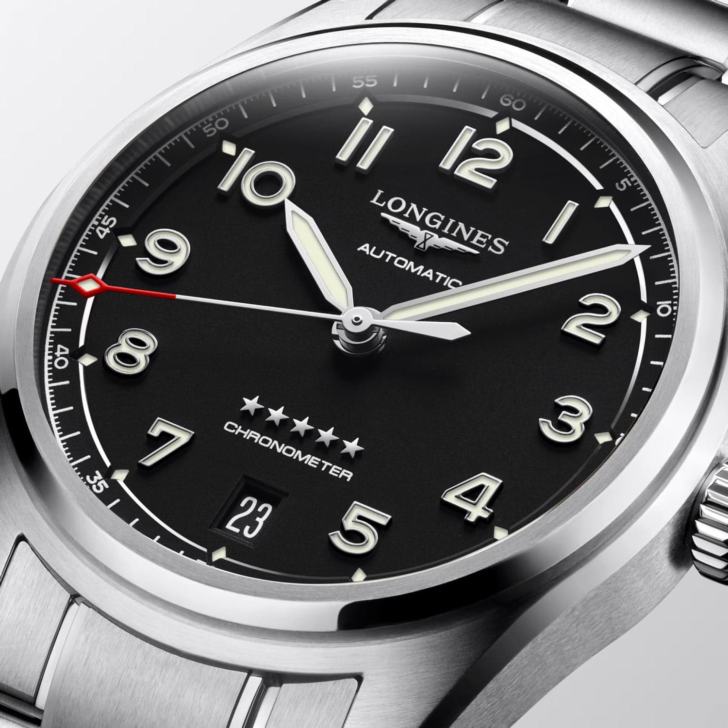 - wysoce czytelna tarcza. Indeksy arabskie są wypełnione białą, matową substancją luminescencyjną Super-LumiNova®, która rozświetla każdy mrok. Zachowano oryginalną czcionkę cyfr, typową dla zegarków w stylu lotniczym Longines.