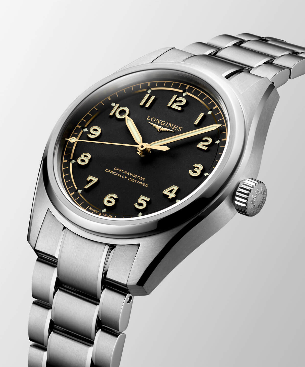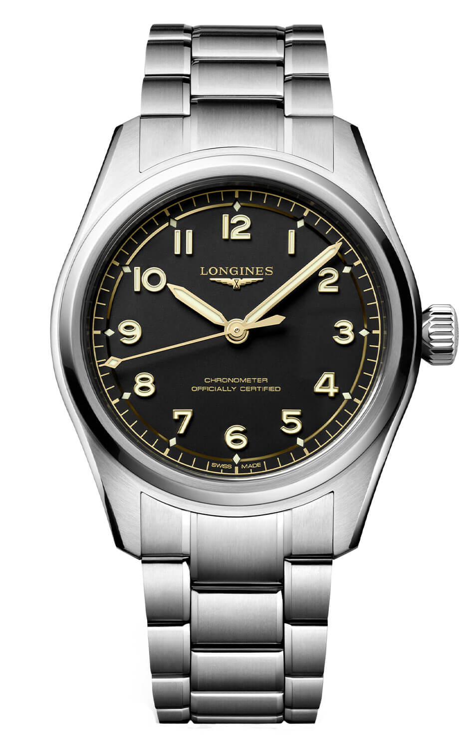 Męski zegarek w stylu lotniczym z certyfikatem chronometru COSC, wyposażony w automatyczny mechanizm L888.4 z 72-godzinną rezerwą chodu. Matowa czarna tarcza, doskonała czytelność i stalowa koperta 39 mm tworzą ponadczasowy instrument czasu.