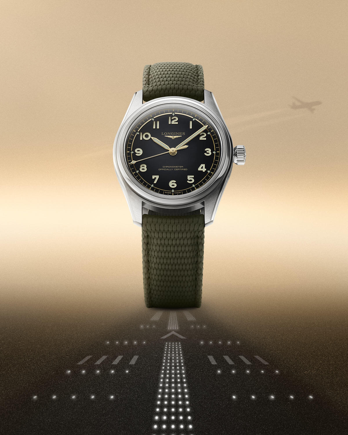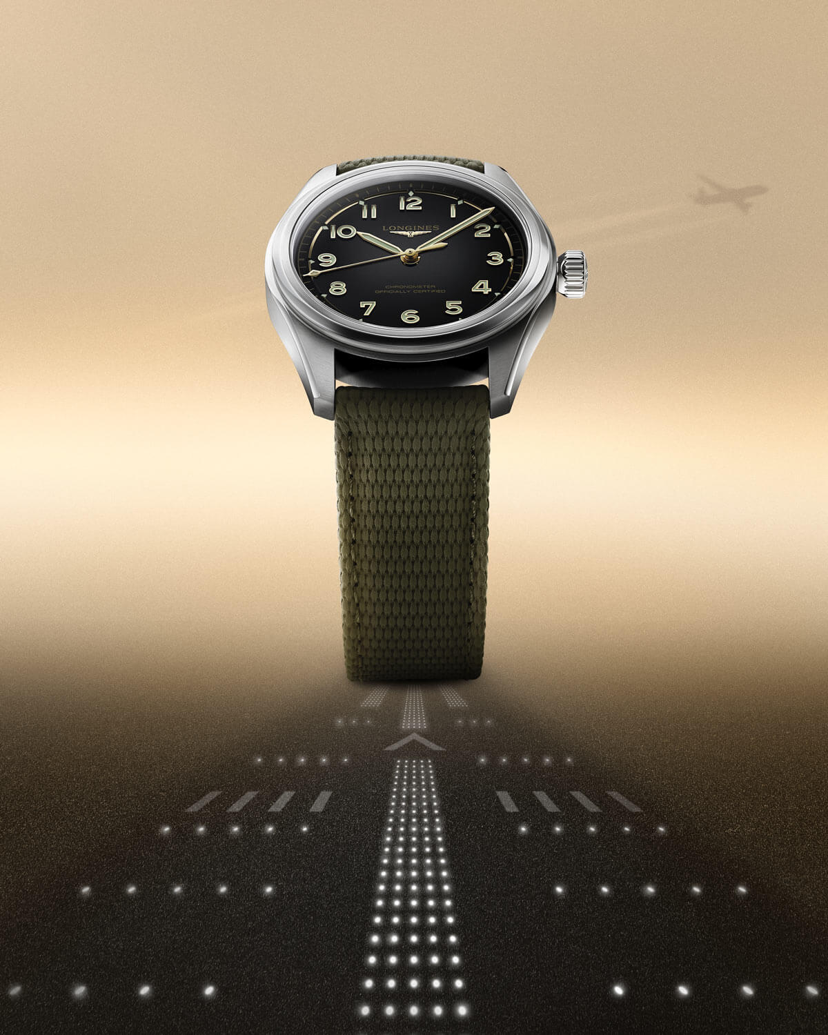 Męski zegarek w stylu lotniczym z certyfikatem chronometru COSC, wyposażony w automatyczny mechanizm L888.4 z 72-godzinną rezerwą chodu. Matowa czarna tarcza, doskonała czytelność i stalowa koperta 39 mm tworzą ponadczasowy instrument czasu.