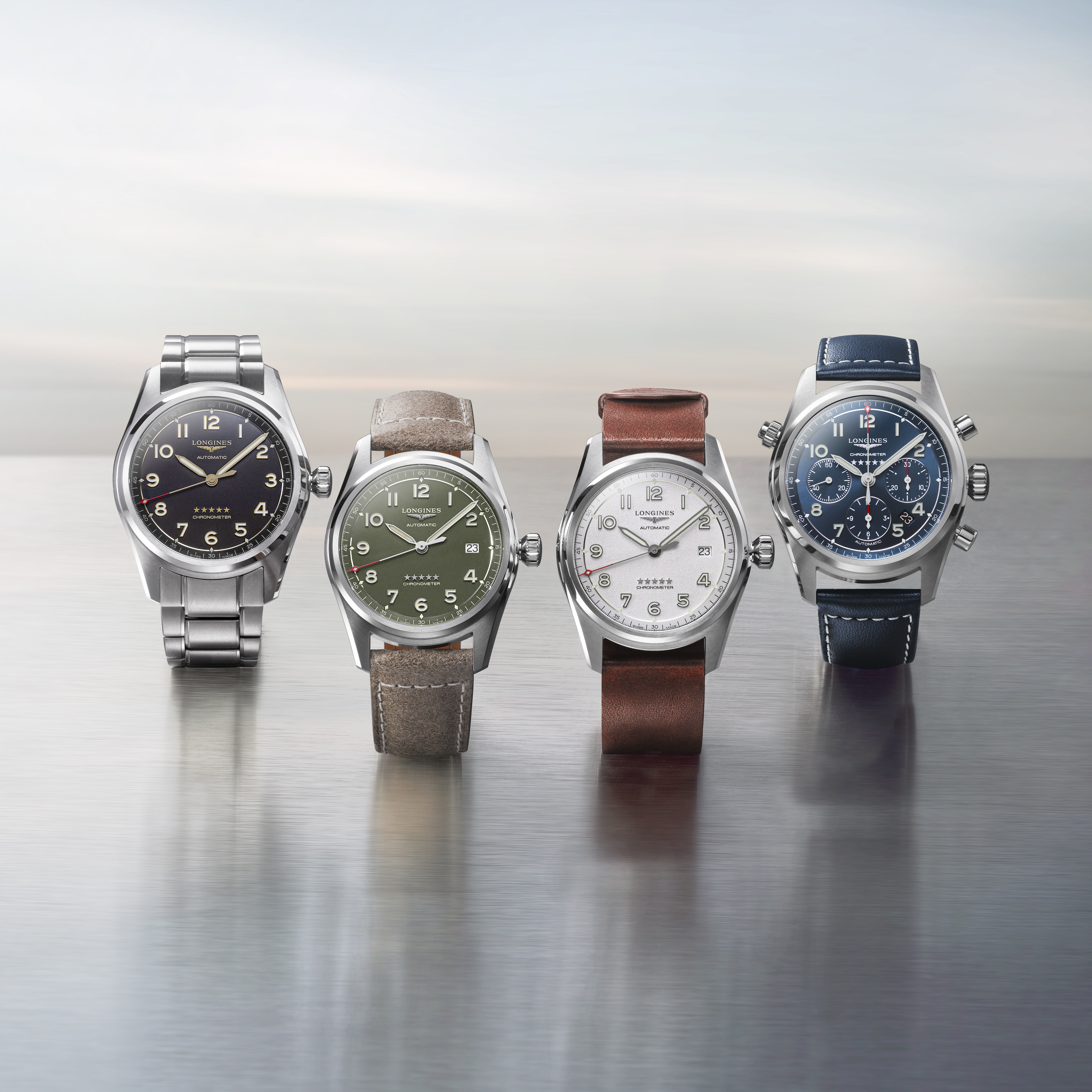 - 5 gwiazd na godzinie szóstej u dołu cyferblatu. Oznaczenie pięciu gwiazd było stosowane w 1950 roku i potwierdzało niezawodność oraz precyzję mechanizmów Longines. Pięć gwiazdek oznaczało maksimum. Ukłon w przeszłość i symbol tożsamości, który pokazuje klasę, do której należy kolekcja Longines Spirit.
