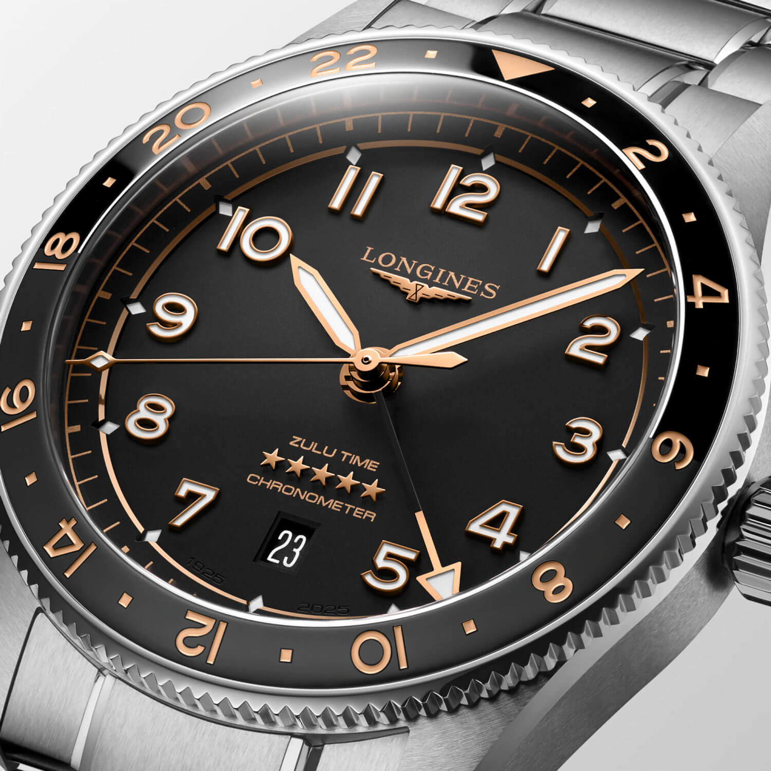 Stalowa koperta o średnicy 42 mm zamknięta została zakręcanym deklem ozdobionym grawerunkiem globu oraz skrzydlatej klepsydry – emblematów eksploracyjnego DNA marki. Luneta obracana w dwóch kierunkach z ceramiczną wkładką podkreśla prestiż zegarka, a skala 24-godzinna umożliwia natychmiastowy odczyt drugiego czasu. Bransoleta ze stali szlachetnej płynnie współgra z obudową, a lekko wypukłe szkło szafirowe z powłoką antyrefleksyjną po obu stronach zapewnia doskonałą czytelność – zarówno w kabinie pilota, jak i na słonecznym tarasie lotniska.