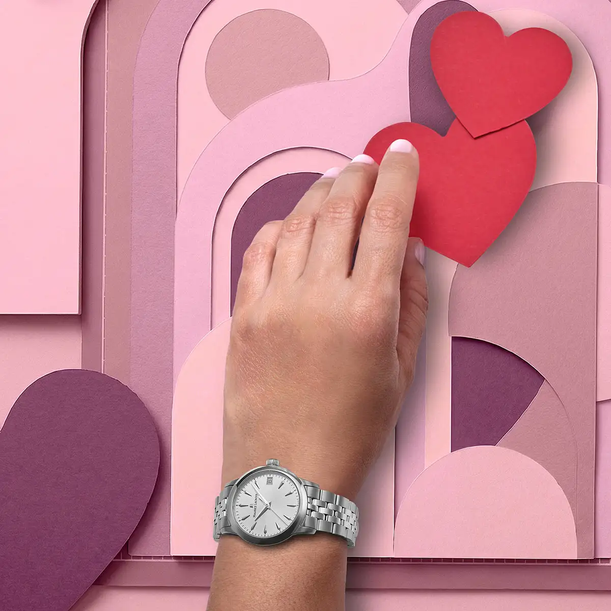 Klasyczny zegarek dla pań o smukłej kopercie o średnicy 33 mm i wysokości zaledwie 8 mm idealnie układa się na kobiecym nadgarstku, oferując retro wygląd inspirowany rokiem powstania marki. Srebrna tarcza ze szlifem słonecznym pięknie współpracuje ze światłem, co widać na zdjęciu, gdzie rodowane indeksy i wskazówki tworzą spójną, luksusową kompozycję. Stalowa koperta łączy powierzchnie polerowane ze szczotkowanymi, co nadaje całości głębi. Za precyzyjne odmierzanie czasu odpowiada sprawdzony mechanizm kwarcowy, wzbogacony o praktyczny datownik na godzinie trzeciej. Co istotne w codziennym użytkowaniu, zegarek wyposażono w szafirowe szkło z podwójną powłoką antyrefleksyjną oraz wysoką klasę wodoszczelności do 100 m, co pozwala na swobodne pływanie bez obaw o zalanie.