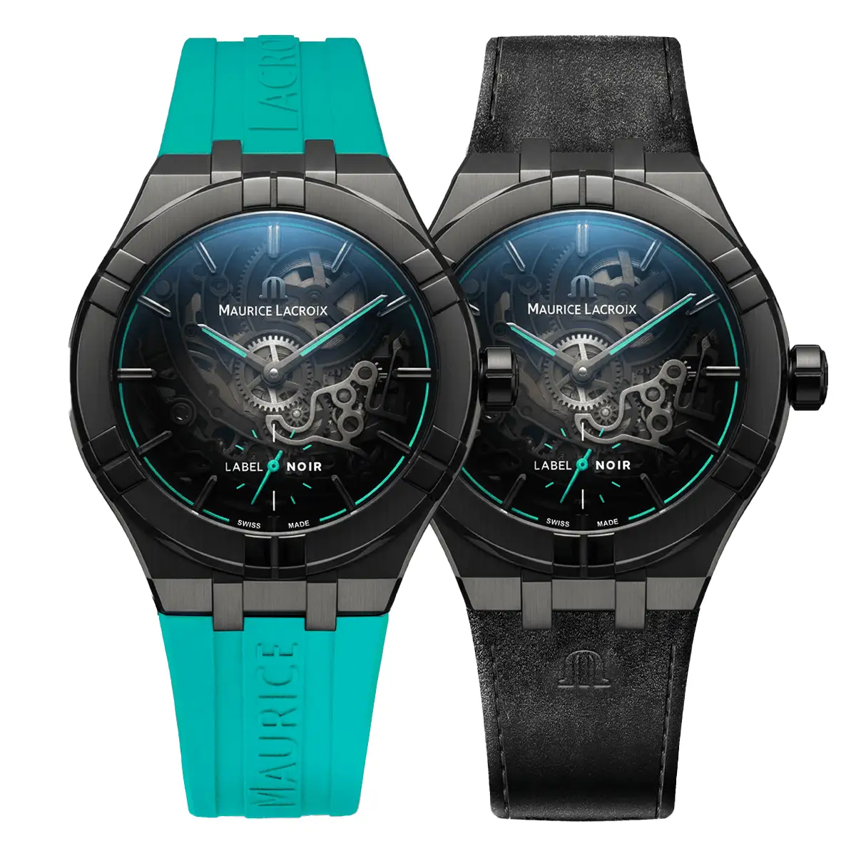 Projekt ten stanowi zaawansowaną interpretację linii Aikon, gdzie stalowa koperta o średnicy 45 mm otrzymała powłokę DLC o wyjątkowej twardości i odporności na ścieranie. Precyzyjnie wykonany mechanizm manufakturowy ML115, którego konstrukcja typu skeleton pozwala na pełną obserwację pracy balansu oraz kół zębatych. Antracytowe wykończenie mostków zestawiono z turkusowymi akcentami tarczy i wskazówek, co zapewnia doskonały kontrast oraz czytelność. Szafirowe szkło z podwójną powłoką antyrefleksyjną gwarantuje krystaliczny wgląd w architekturę kalibru pod każdym kątem. Do zegarka dołączono dwa dedykowane paski: sportowy, turkusowy wykonany z wysokogatunkowej gumy oraz elegancki, czarny pasek skórzany o technicznej fakturze. Dzięki systemowi Easy Change wymiana paska jest intuicyjna i nie wymaga użycia dodatkowych narzędzi.