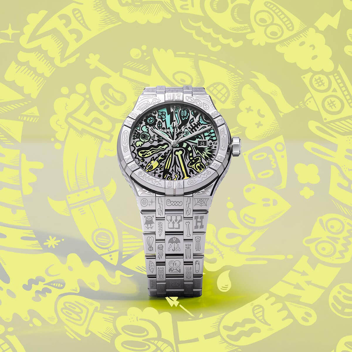 42-milimetrowa stalowa koperta, bransoleta oraz bezel zostały w całości pokryte finezyjnym grawerem, pełnym charakterystycznych dla motywów Wotto – od uroczych, nieco ekscentrycznych postaci, przez błyskawice i serduszka, aż po duchy na deskorolkach. Artystyczna kompozycja, przypominająca hieroglify, płynnie przechodzi z bransolety na kopertę i tarczę, tworząc jednolitą wizję, której każdy detal opowiada własną historię. Wzory te zyskują jeszcze większą głębię dzięki kontrastowi między polerowanym wykończeniem a matowymi grawerami. Sama tarcza wyróżnia się na tle innych modeli z serii Urban Tribe – Wotto otrzymał pełną swobodę twórczą i wykorzystał ją w pełni, tworząc dynamiczną kompozycję figlarnych postaci, układających się w gradient od żółtego do niebieskiego. Indeksy są minimalistyczne, by nie odwracać uwagi od tej barwnej eksplozji kreatywności, podkreślając jednocześnie unikatowy charakter czasomierza.