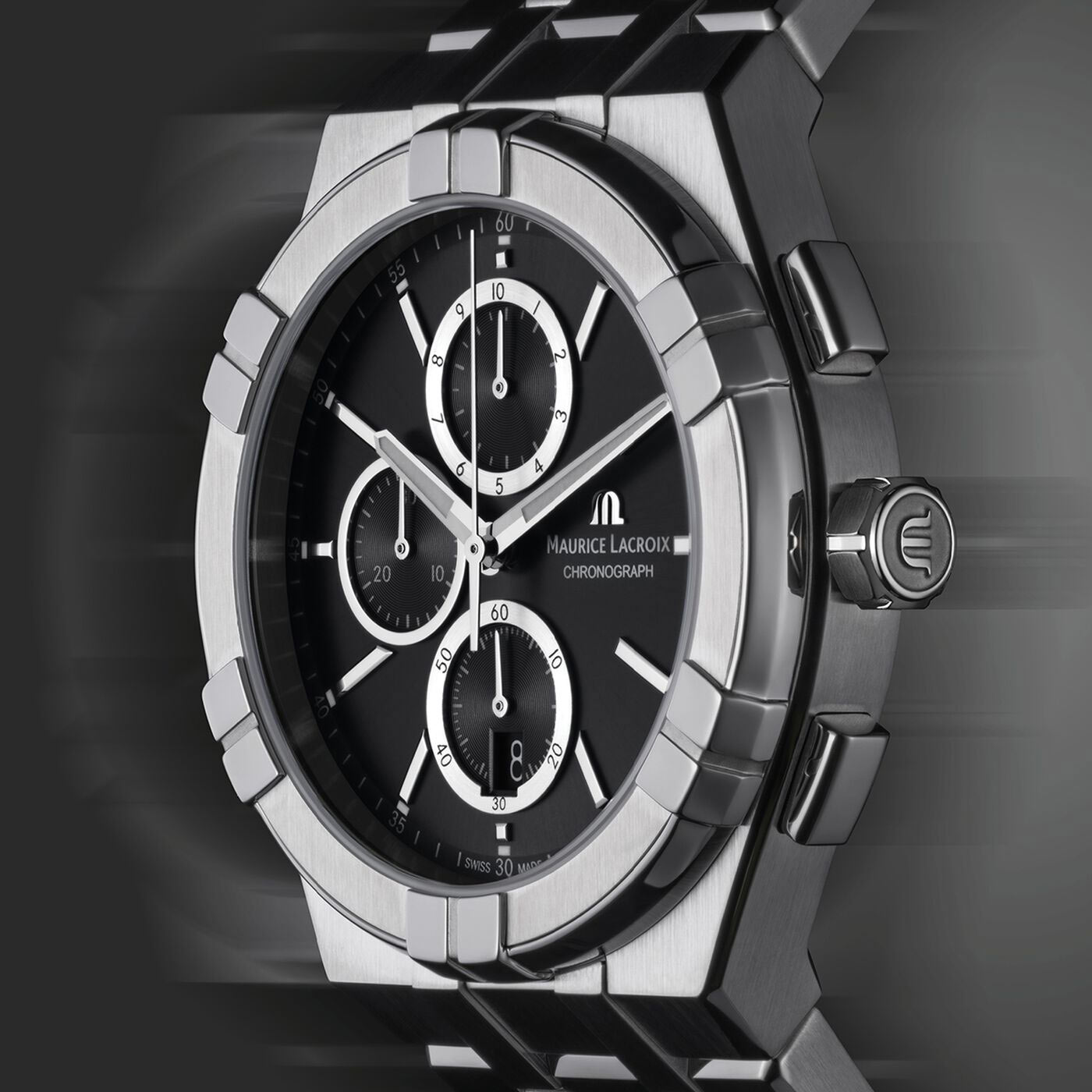 Na przedniej części obudowy, nałożone zostało odporne na zarysowania szkło szafirowe z powłoką antyrefleksyjną. Antyrefleks to powłoka, która odbija promienie światła, co zwiększa klarowność odczytu tarczy. Czarna tarcza została wzbogacona o szczotkowane wykończenie, które w zjawiskowy sposób łączy się ze światłem, zapewniając znaczny stopień wyrafinowania. Na tarczy nałożone zostały specjalne liczniki chronografu. Zegarek męski Maurice Lacroix AIKON Quartz Chronograph jest idealny do odmierzania czasu spotkania biznesowego, podróży lub aktywności fizycznych. Okno datownika na godzinie 6 stanowi przydatną pomoc w obserwacji upływających dni w kalendarzu. Zegarek Maurice Lacroix na bransolecie napędzany jest przez szwajcarski mechanizm z etykietą swiss made. Gwarantuje on bardzo dobrą pracę wskazówek, datownika oraz liczników chronografu.