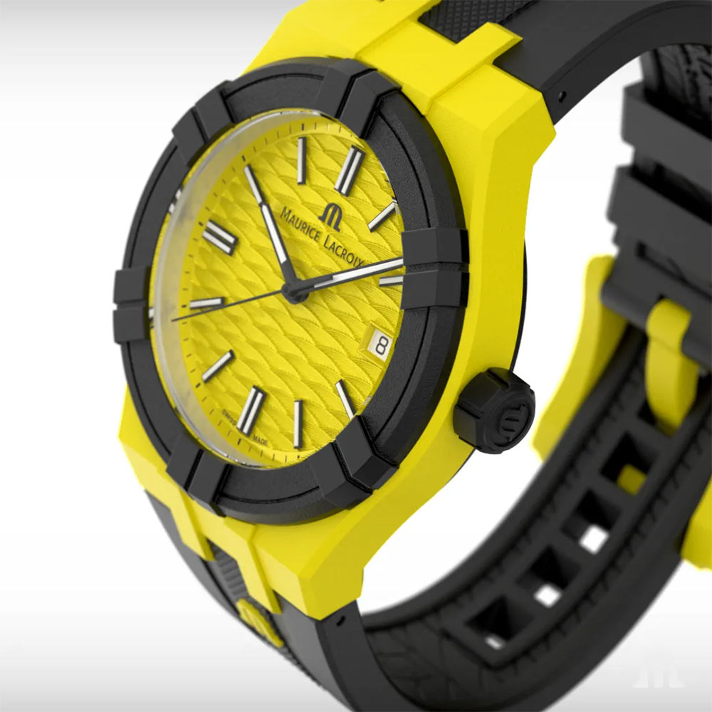 Maurice Lacroix prezentuje swoją najnowszą kolekcję Tide — przypływ, który ma być natychmiast zauważony. Czarno-żółty zegarek Maurice Lacroix Aikon Tide posiada cechy tożsame z innymi członkami rodziny Aikon, lecz wyróżnia go materiał obudowy. Jego modna, żółta koperta o uniwersalnym rozmiarze 40 mm jest wykonana z tworzywa recyklingowego #tide ocean®. Tworzywo to powstaje przy użyciu rewolucyjnej technologii, które przekształca wyrzucone do oceanu odpady z plastikowych tworzyw w szwajcarskie czasomierze o wysokiej jakości.