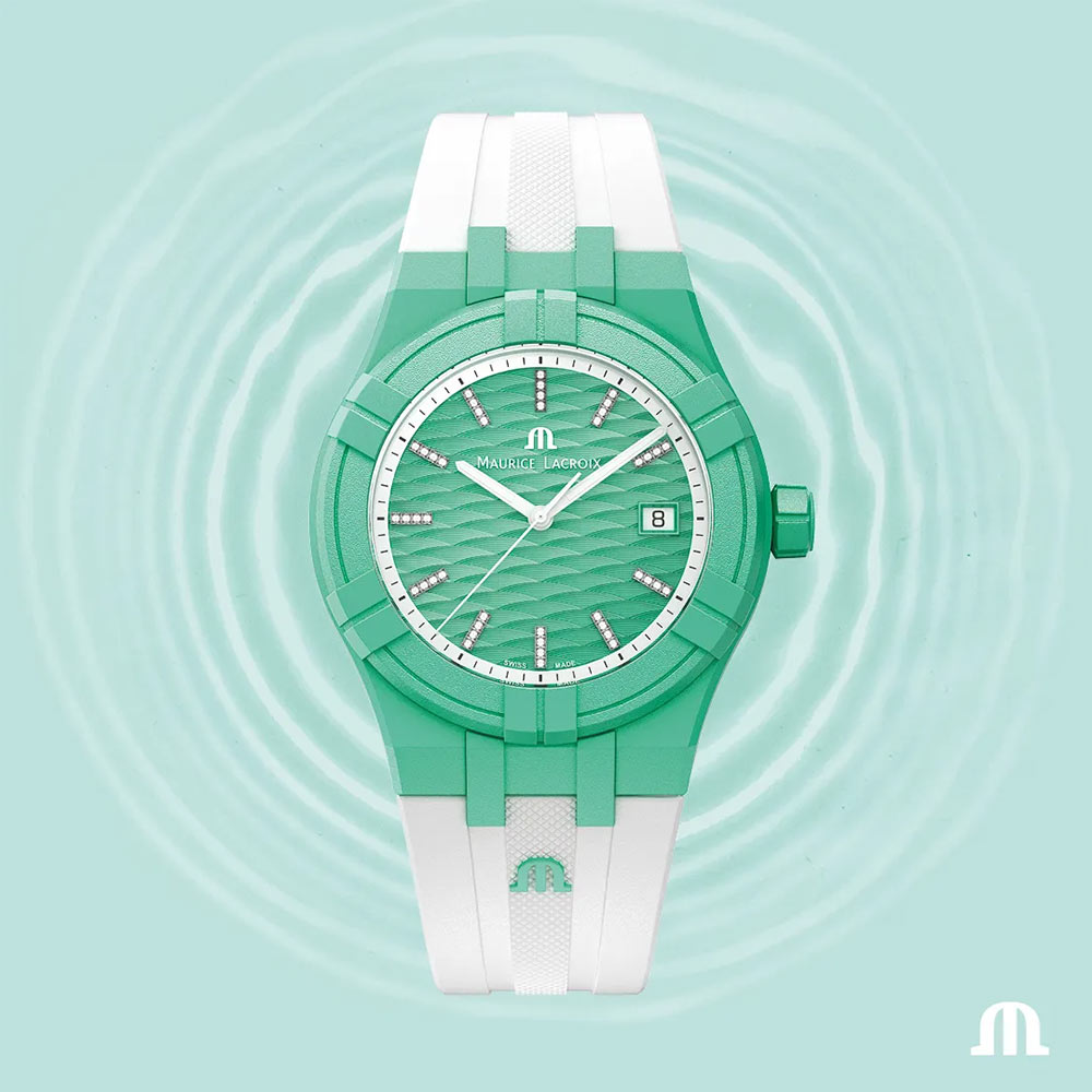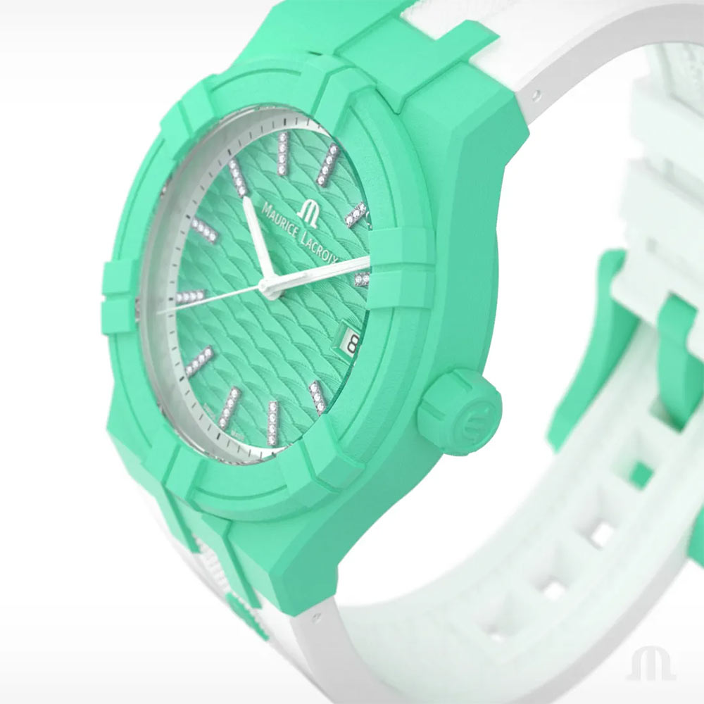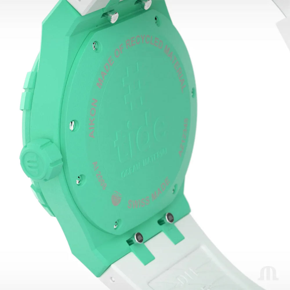 Maurice Lacroix prezentuje swoją najnowszą kolekcję Tide — przypływ, który ma być natychmiast zauważony. Zielono-biały zegarek Maurice Lacroix Aikon Tide posiada cechy tożsame z innymi członkami rodziny Aikon, lecz wyróżnia go materiał obudowy. Jego modna, zielona koperta o uniwersalnym rozmiarze 40 mm jest wykonana z tworzywa recyklingowego #tide ocean®. Tworzywo to powstaje przy użyciu rewolucyjnej technologii, które przekształca wyrzucone do oceanu odpady z plastikowych tworzyw w szwajcarskie czasomierze o wysokiej jakości.