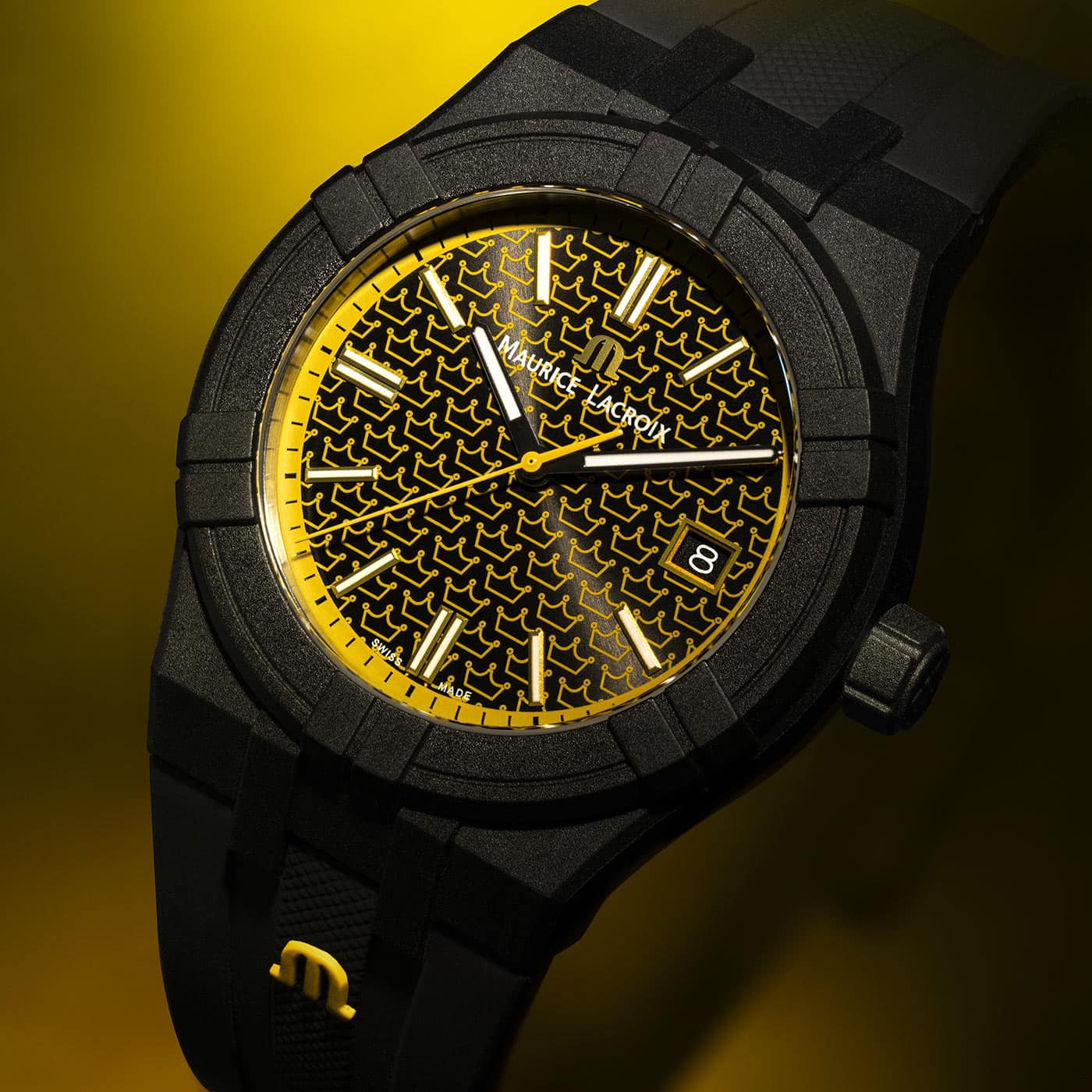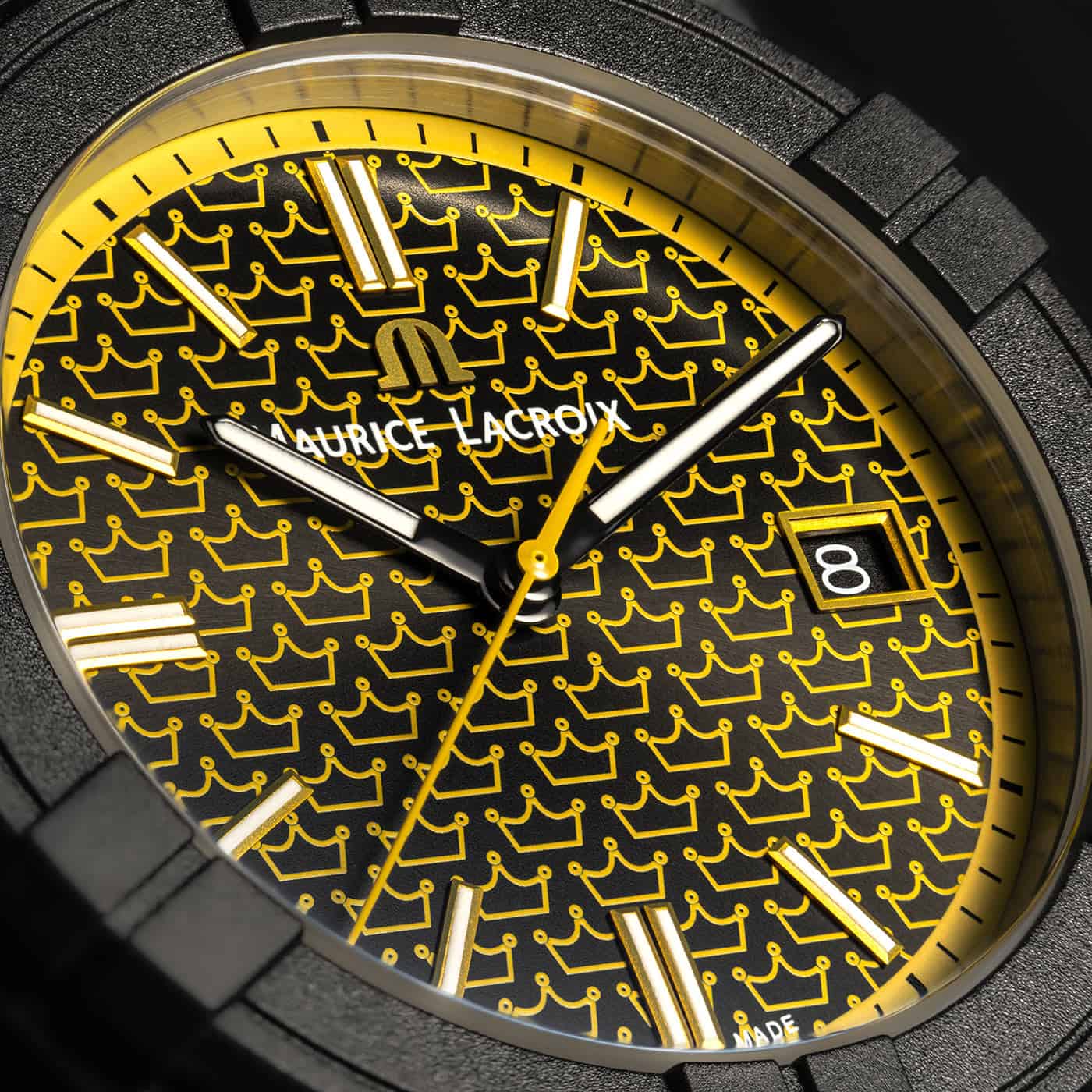 Zegarek Maurice Lacroix w specjalnej edycji KOTC od frontu zabezpieczony został wysoce odpornym na zarysowania szafirowym szkłem z podwójnym antyrefleksem. Pod transparentnym oknem producent umieścił czarną tarczę ozdobioną wzorem w postaci złotej korony. Aktualną godzinę wskazują czarne wskazówki godzinowa i minutowa, której towarzyszy żółta kontrastowa wskazówka sekundowa. Wskazówka godzinowa i minutowa jak i znaczniki godzinowe wyposażone zostały w świecącą masę Super-LumiNova® Swiss Made. Pomoże ona odczytać aktualną godzinę w gorszych warunkach oświetleniowych. Godzina trzecia na tarczy zarezerwowana została dla okna datownika, które wskazuje aktualny dzień miesiąca.