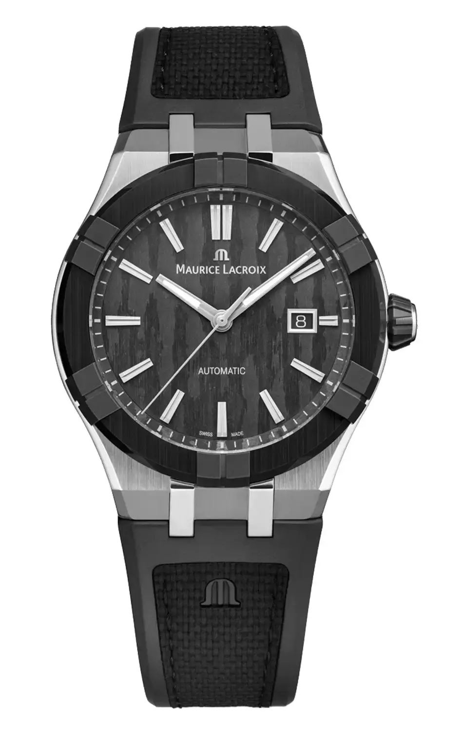 Maurice Lacroix to męski zegarek o sportowo-eleganckim charakterze, wyposażony w stalową kopertę 43 mm z ceramicznym bezelem i szafirowym szkłem z antyrefleksem. Tarcza z włókna węglowego nadaje mu nowoczesnej dynamiki, a pasek gumowy w czarnym kolorze zapewnia komfort noszenia. Precyzję odmierzania czasu gwarantuje automatyczny kaliber ML1000 z 60-godzinną rezerwą chodu.