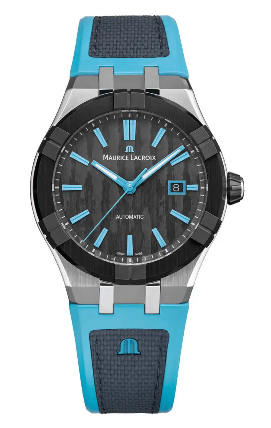 Maurice Lacroix to męski zegarek o sportowo-eleganckim charakterze, wyposażony w stalową kopertę 43 mm z ceramicznym bezelem i szafirowym szkłem z antyrefleksem. Tarcza z włókna węglowego z niebieskimi indeksami nadaje mu nowoczesnej dynamiki, a pasek gumowy w turkusowo-czarnym kolorze zapewnia komfort noszenia. Precyzję odmierzania czasu gwarantuje automatyczny kaliber ML1000 z 60-godzinną rezerwą chodu.