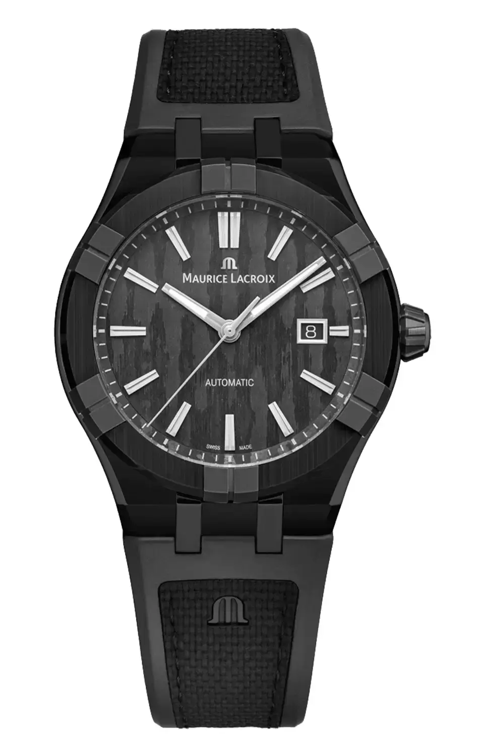 Miejski zegarek Maurice Lacroix z kolekcji Aikon – nowej generacji ikony szwajcarskiego stylu. Model z karbonową tarczą, tytanową kopertą pokrytą DLC oraz ceramicznym pierścieniem z charakterystycznymi ramionami, osadzony na pasku z bi-gumy. Wewnątrz pracuje manufakturowy kaliber automatyczny ML1000 z ok. 60-godzinną rezerwą chodu, a opatentowany system ML Easy Change pozwala błyskawicznie wymienić pasek bez użycia narzędzi.