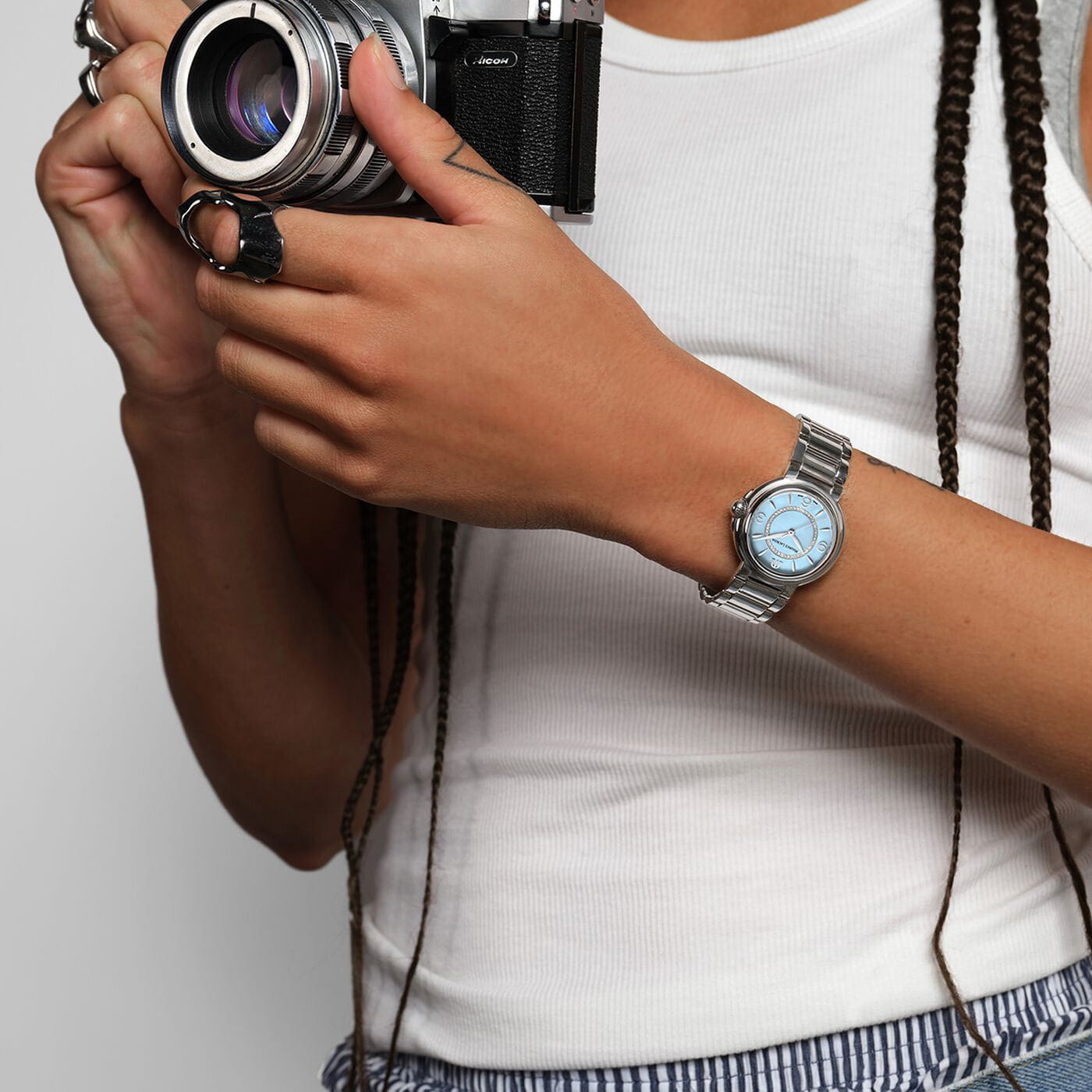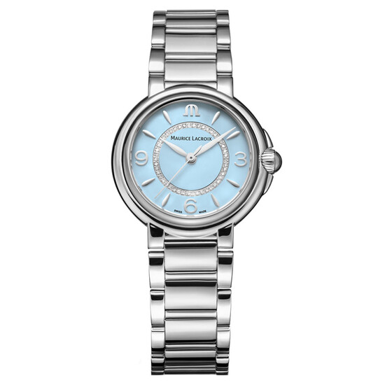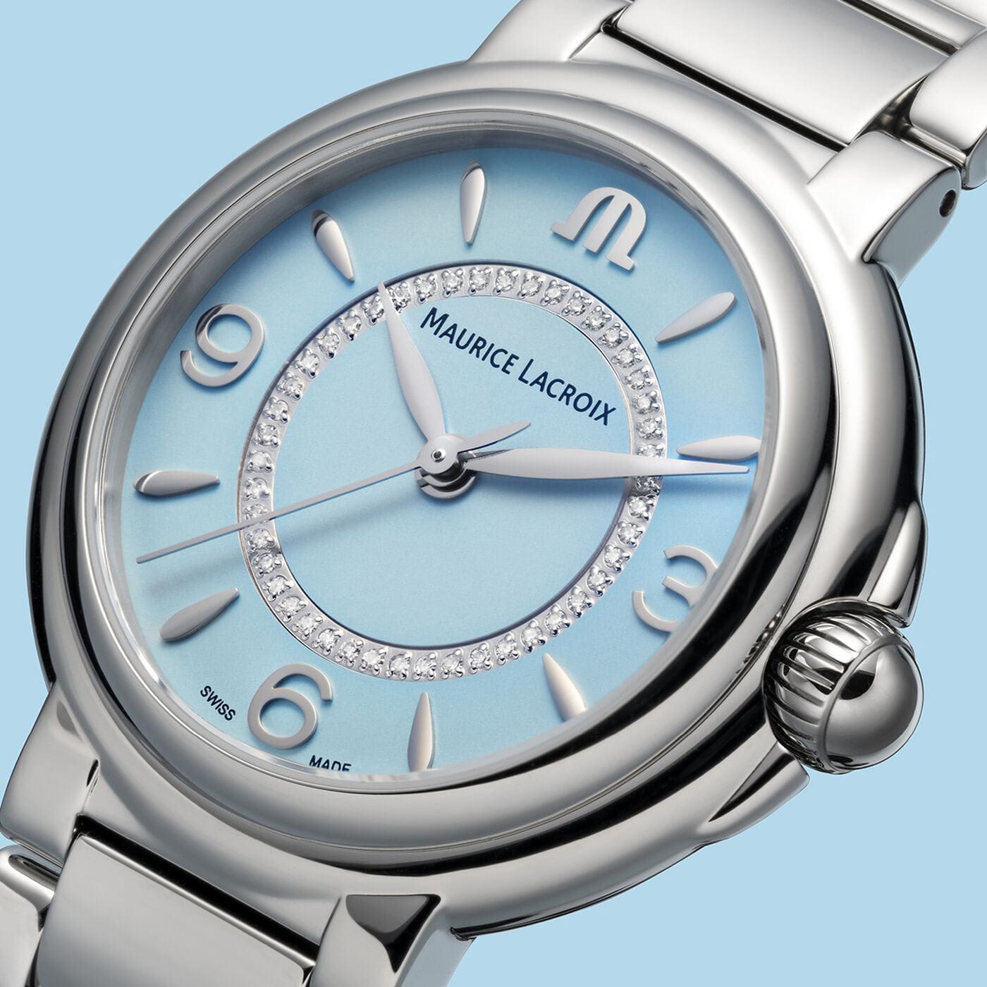 Wskazówki godzinowa i minutowa, stylizowane na delikatne liście, wraz z lekkim, środkowym sekundnikiem, nadają zegarkowi charakterystyczny wygląd. Każda godzina jest oznaczona eleganckim indeksem w kształcie łzy lub arabską cyfrą, z wyjątkiem godziny 12, gdzie logo marki M dumnie wskazuje północ. Centralna część jasnoniebieskiej tarczy "Baby Blue" otoczona jest lśniącym pierścieniem, który mieści 46 prawdziwych diamentów SI, o łącznej masie 0.1242 karata, dodając subtelnego, ale zauważalnego blasku temu wyjątkowemu dziełu. Całość chroniona jest wysoce odpornym na zarysowania szkłem szafirowym z podwójną powłoką antyrefleksyjną, zapewniającym trwałość, prezencję oraz klarowny odczyt. Pod tarczą zainstalowany został szwajcarski mechanizm kwarcowy zasilany baterią.