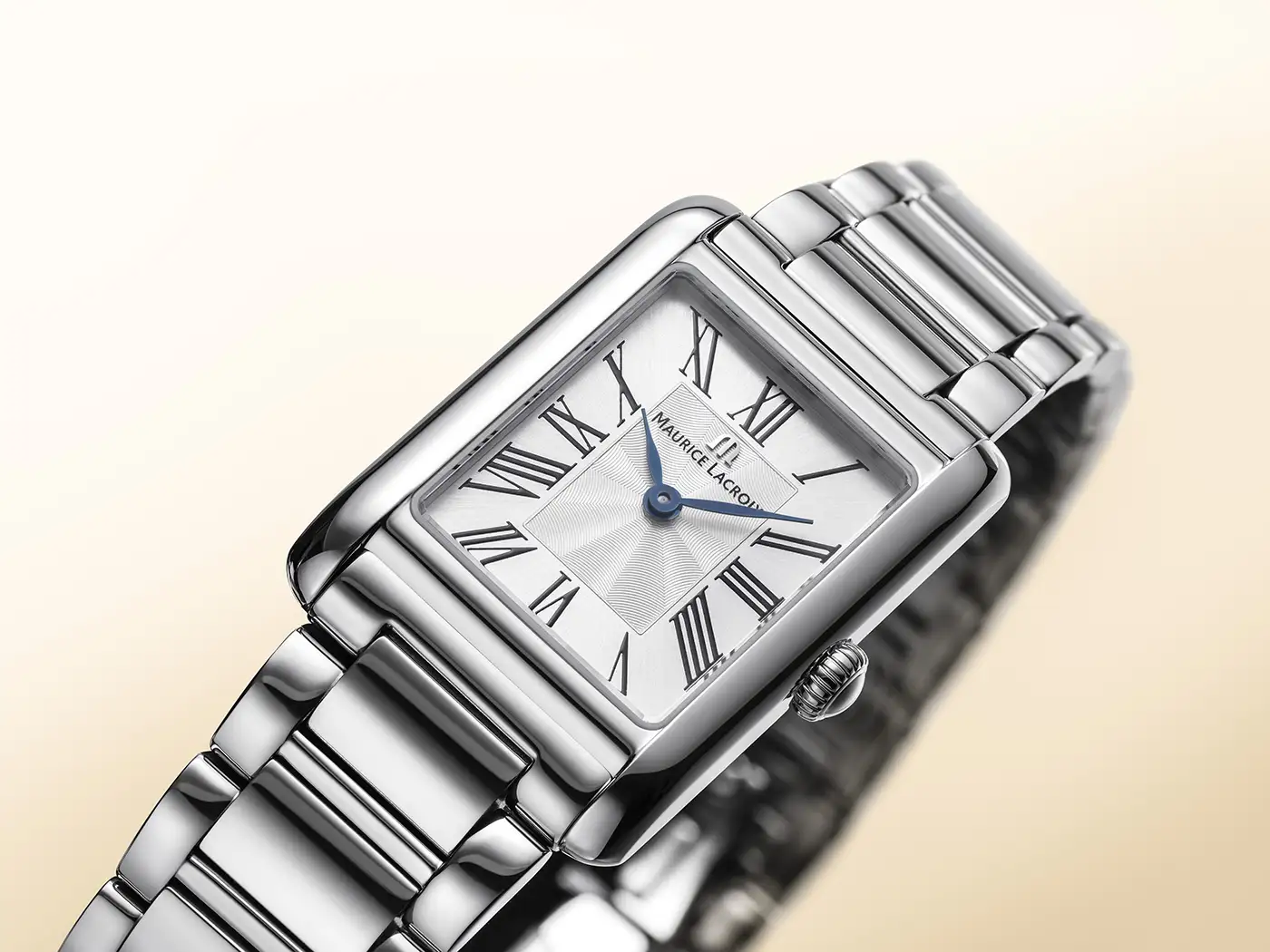 Na srebrnej, szczotkowanej tarczy przykrytej odpornym na zarysowania szkłem szafirowym z podwójną powłoką antyrefleksyjną uwagę przykuwa centralna strefa giloszowana w stylu flinqué – subtelna fala przechodząca przez środek tarczy delikatnie podkreśla kompozycję. Dominują tu wyraźne, czarne cyfry – detal, który czyni ten model doskonałym wyborem dla miłośniczek klasyki, szukających zegarka damskiego z cyframi rzymskimi Maurice Lacroix. Kompozycję dopełniają oksydowane na niebiesko wskazówki, które wnoszą wyrazisty akcent estetyczny. Napędzany szwajcarskim mechanizmem kwarcowym Ronda 762E, zegarek oferuje niezawodność i aż 10-letnią rezerwę chodu. Wodoszczelność do około 5 ATM zapewnia codzienny komfort bez kompromisu dla stylu, jaki reprezentuje każdy zegarek damski w stylu klasycznym marki Maurice Lacroix.